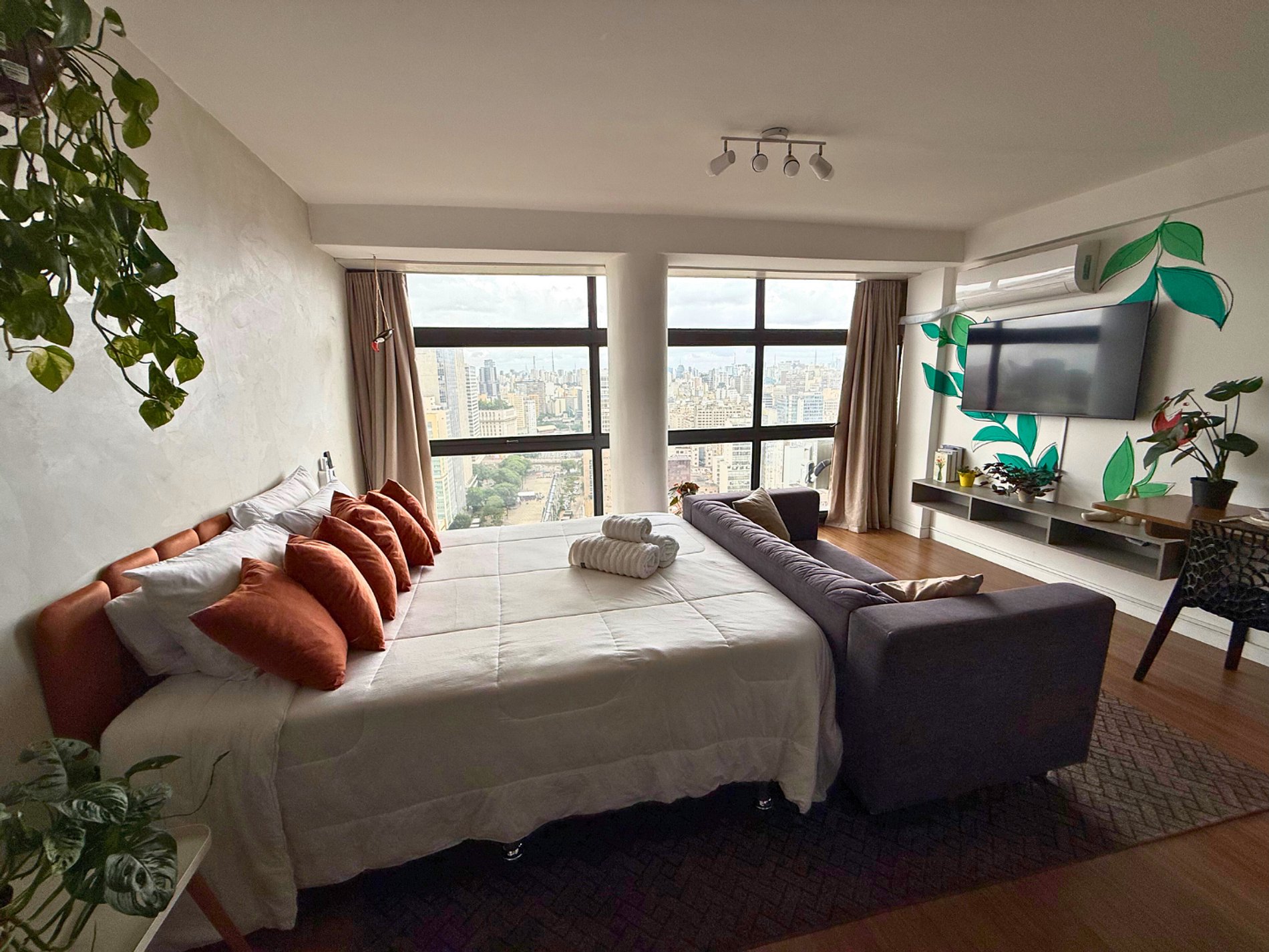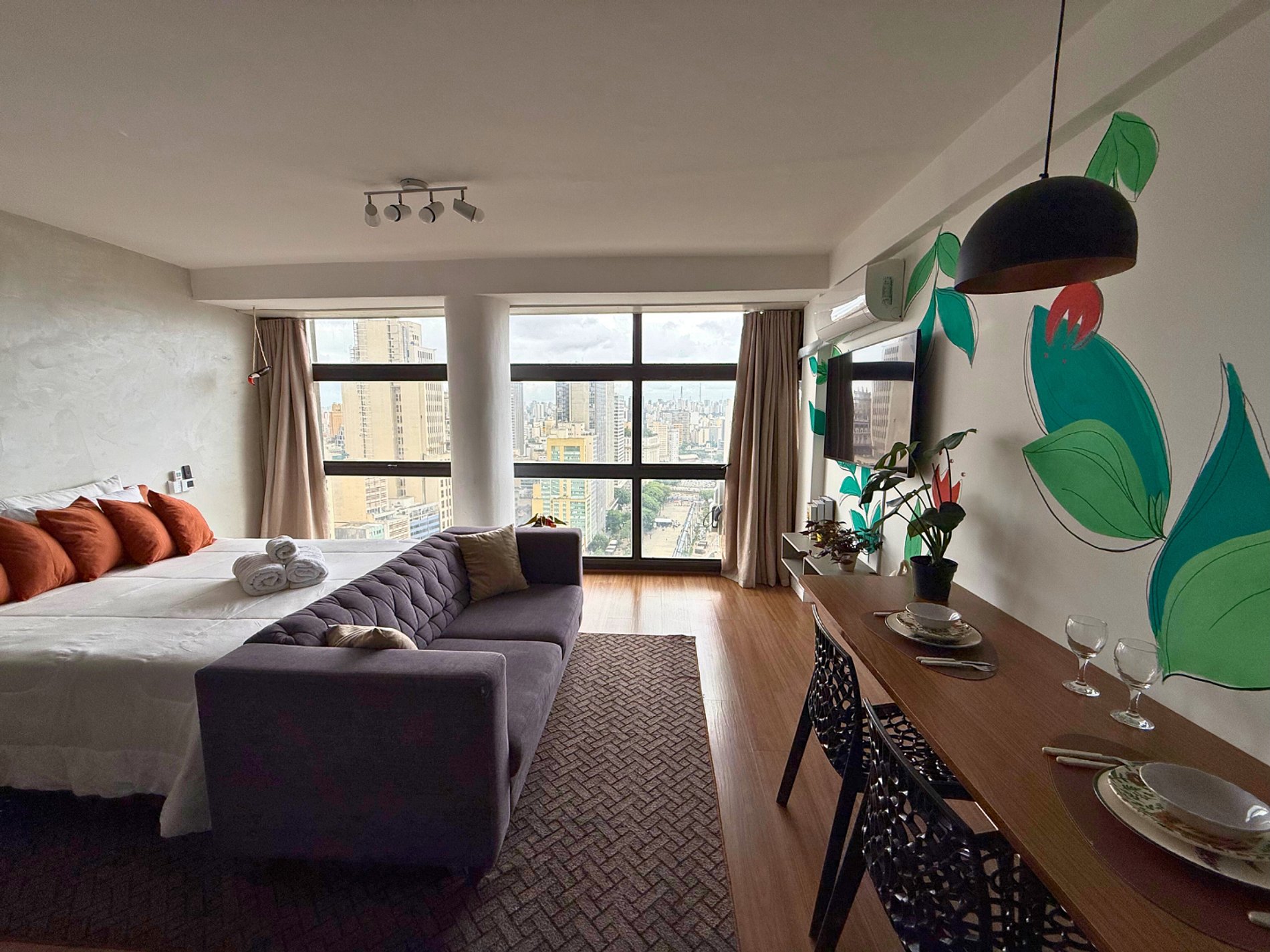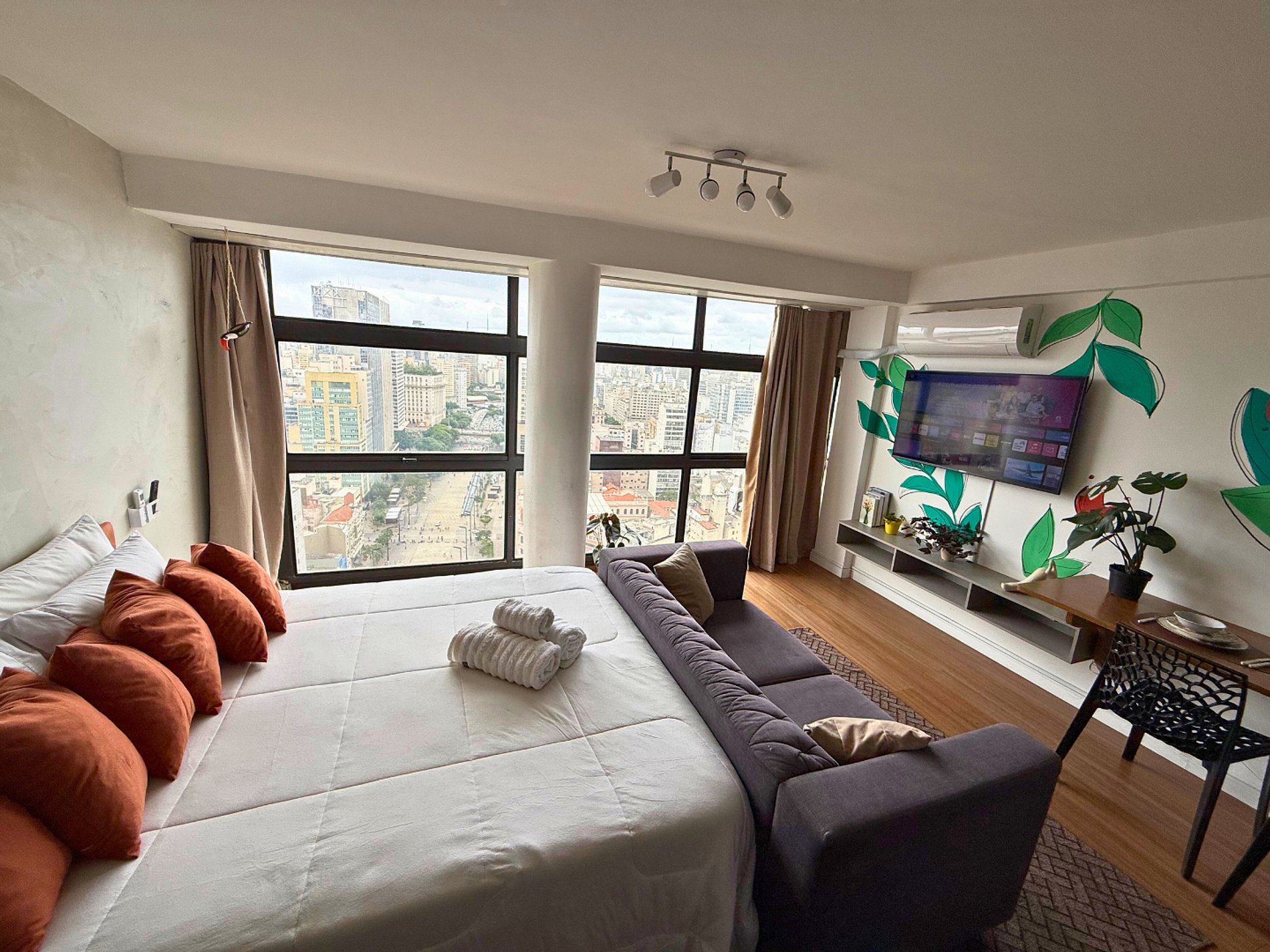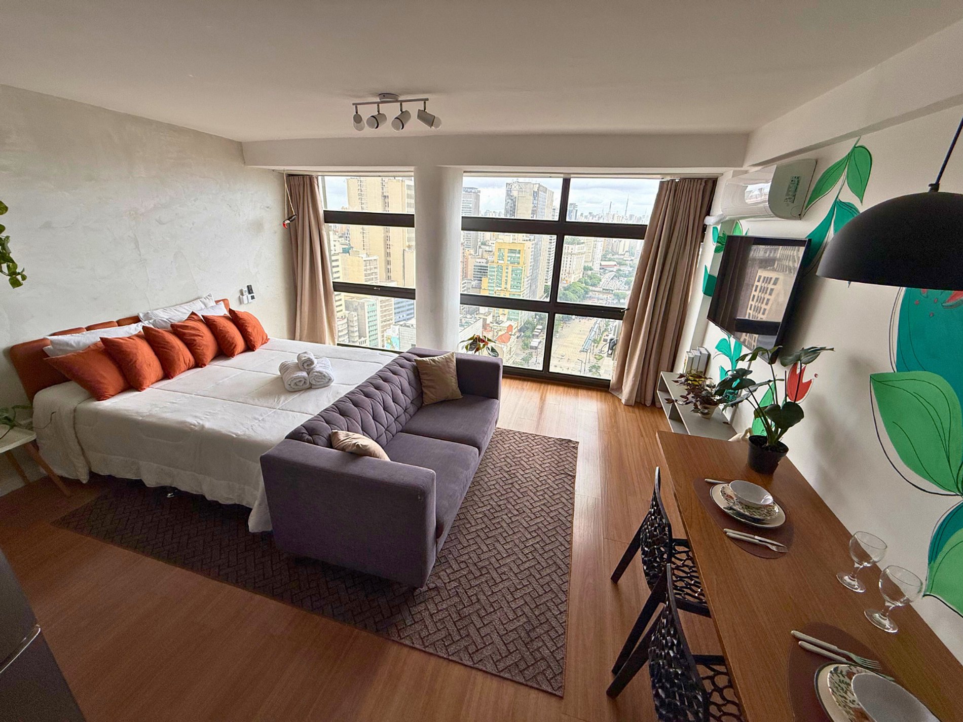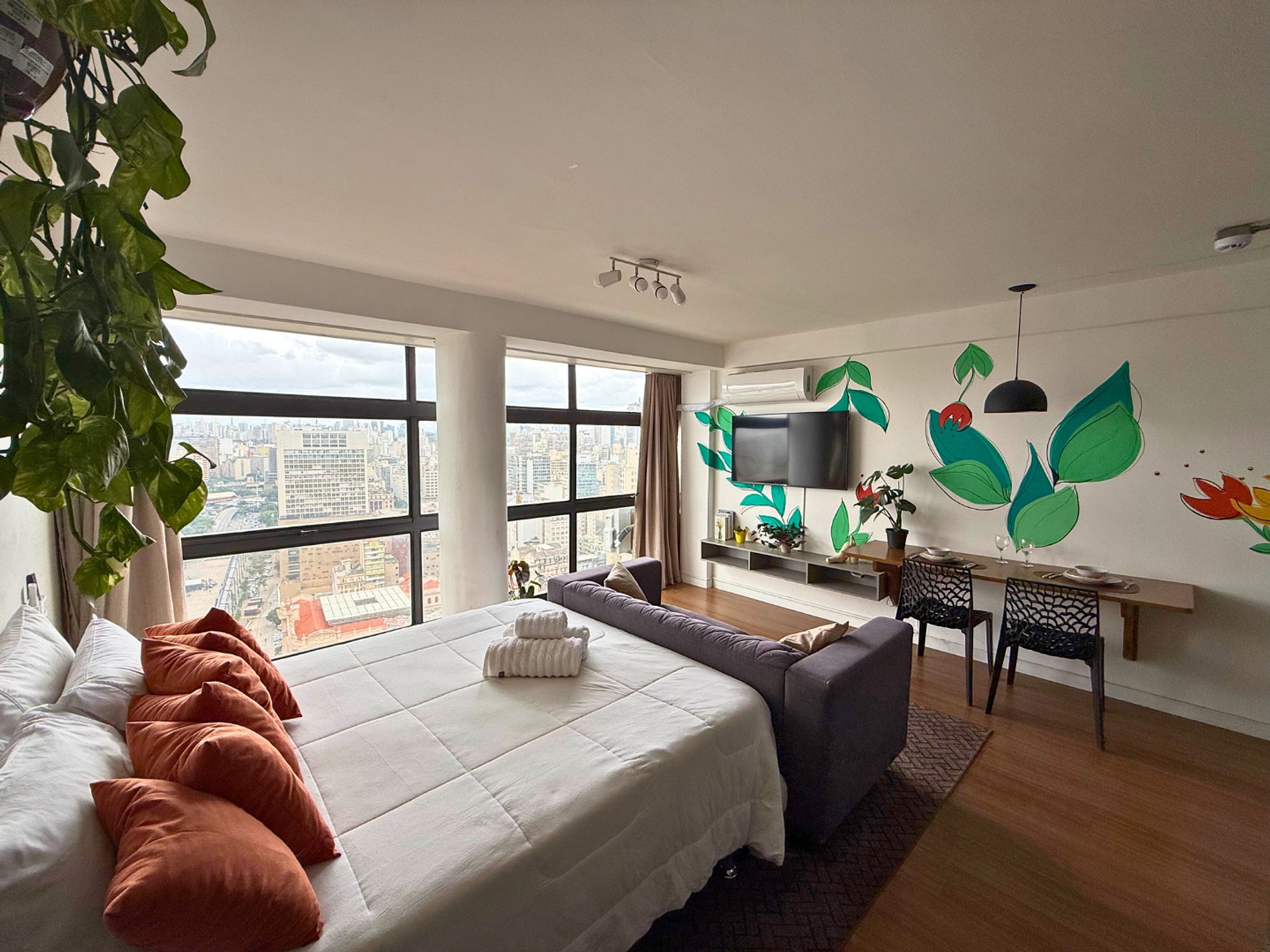 No 39º andar, voltado para o Vale do Anhangabaú, nosso Refúgio Floresta busca trazer a tranquilidade da natureza para o urbano. Apto cheio de comodidades. Dentre elas, destacamos a Smart TV, espaço de trabalho, internet de alta velocidade, cozinha completa com todos utensílios, guarda roupa, amplo banheiro, cama confortável com jogo completo de roupas de cama e banho, além de uma decoração linda composta por um trabalho artístico e diversas plantas naturais espalhadas por todo o apto.