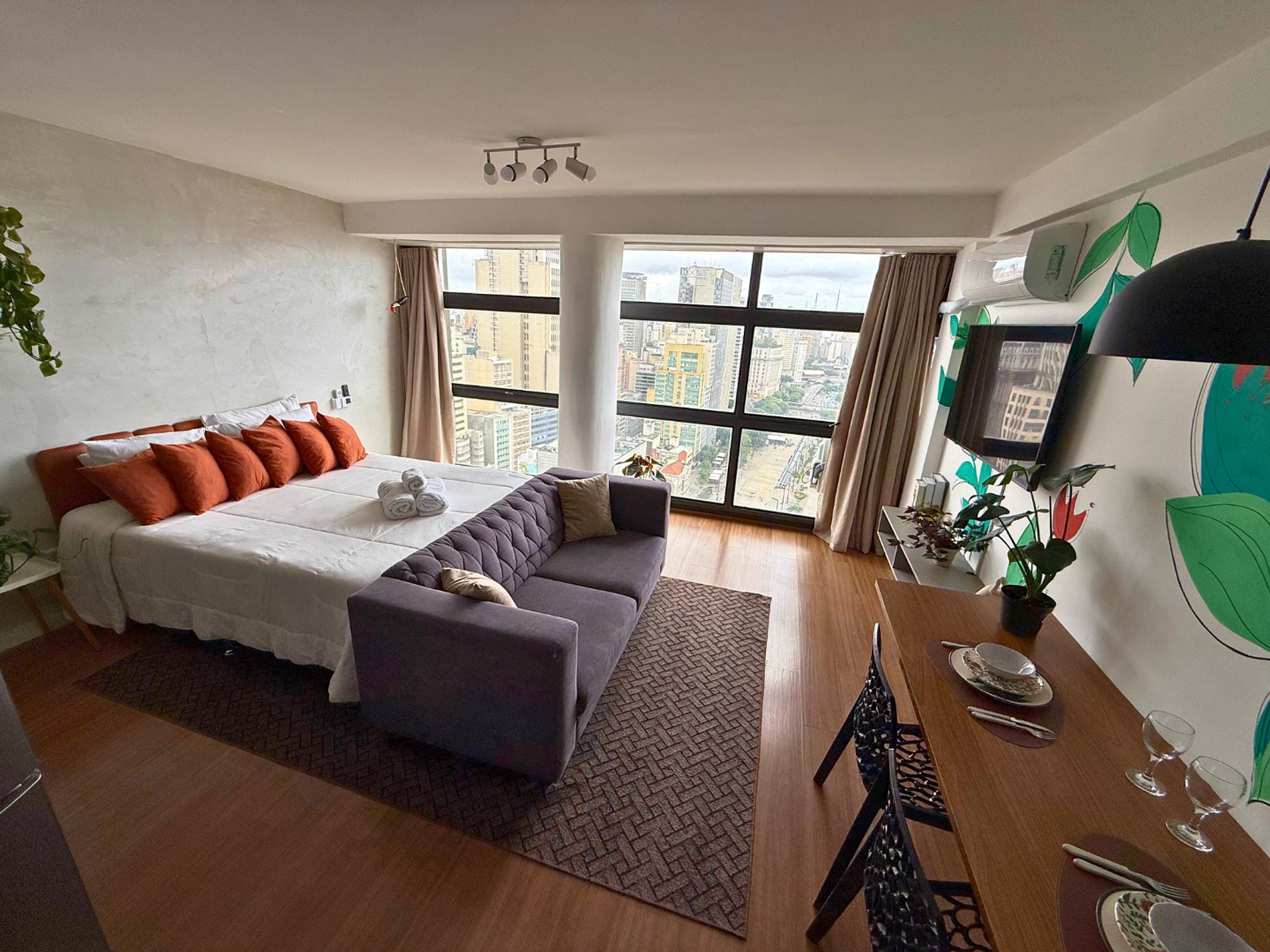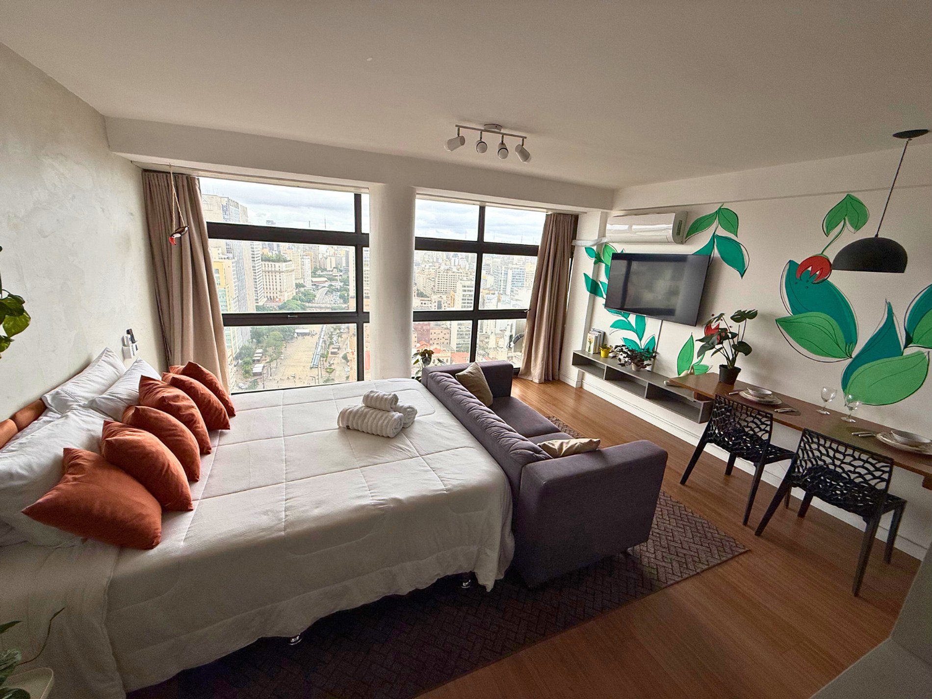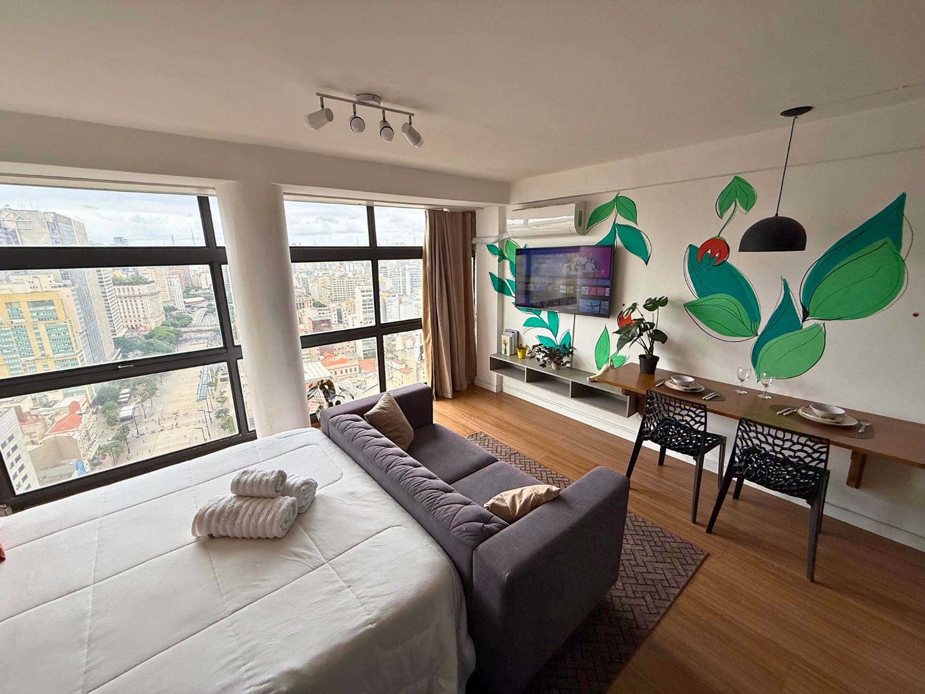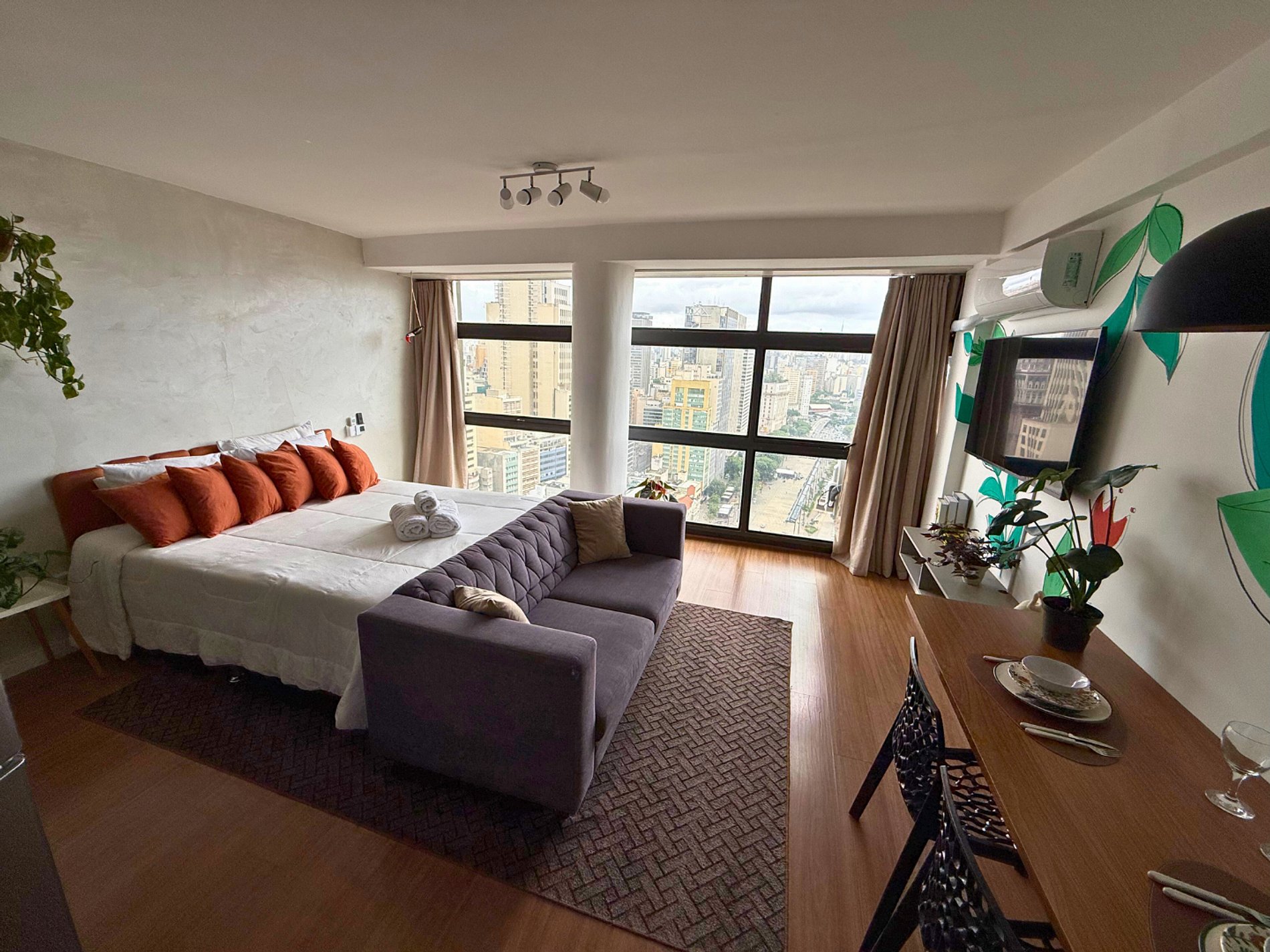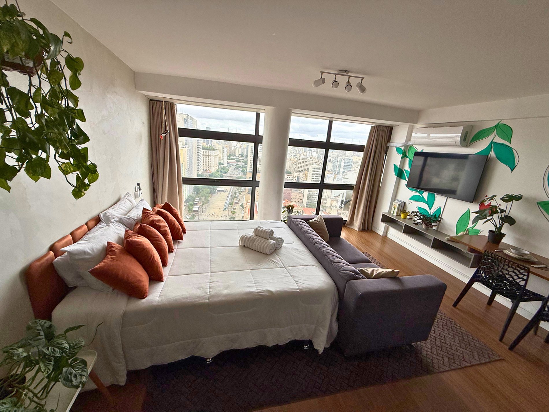 No 39º andar, voltado para o Vale do Anhangabaú, nosso Refúgio Floresta busca trazer a tranquilidade da natureza para o urbano. Apto cheio de comodidades. Dentre elas, destacamos a Smart TV, espaço de trabalho, internet de alta velocidade, cozinha completa com todos utensílios, guarda roupa, amplo banheiro, cama confortável com jogo completo de roupas de cama e banho, além de uma decoração linda composta por um trabalho artístico e diversas plantas naturais espalhadas por todo o apto.
