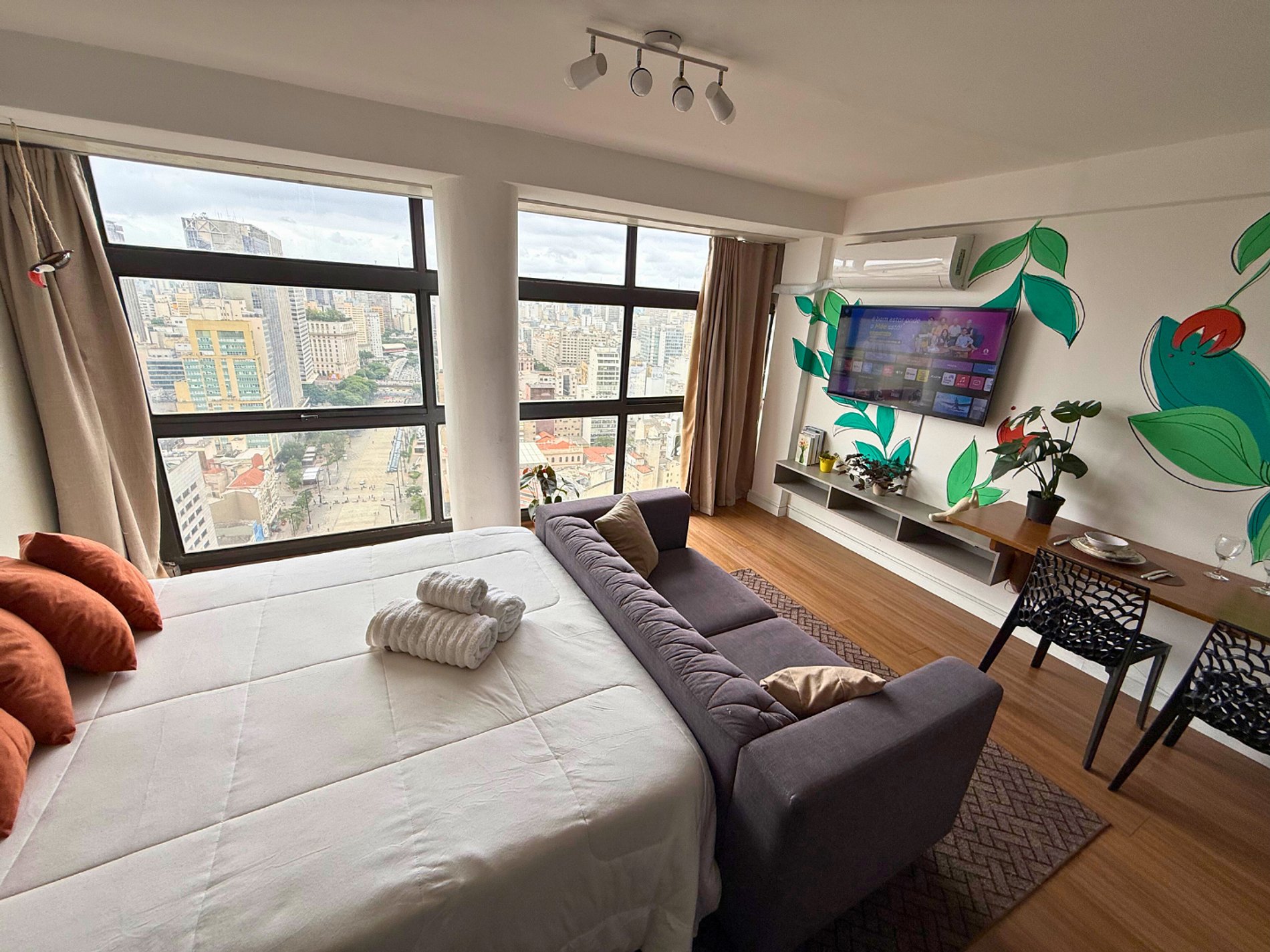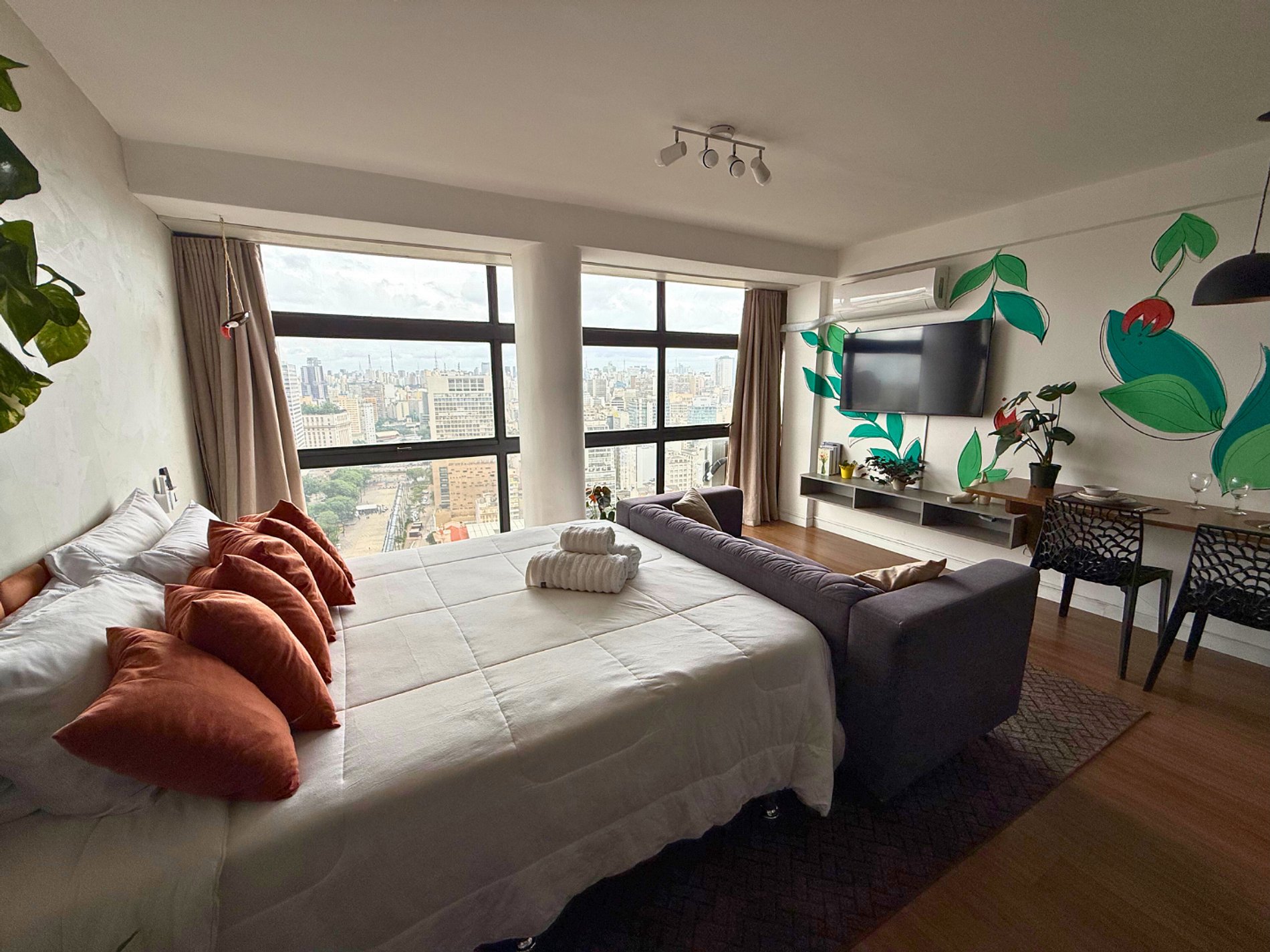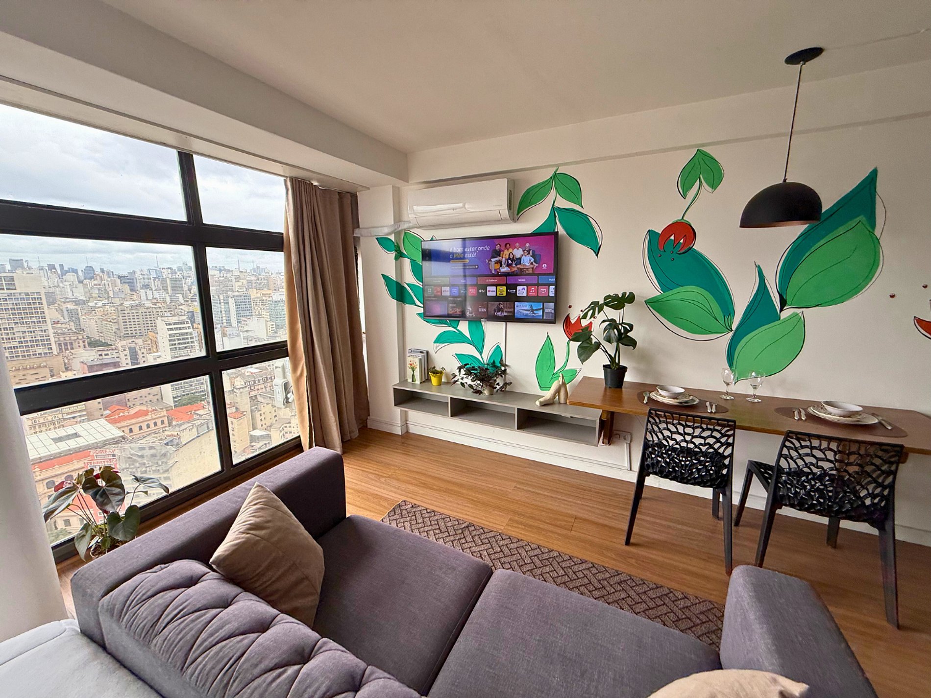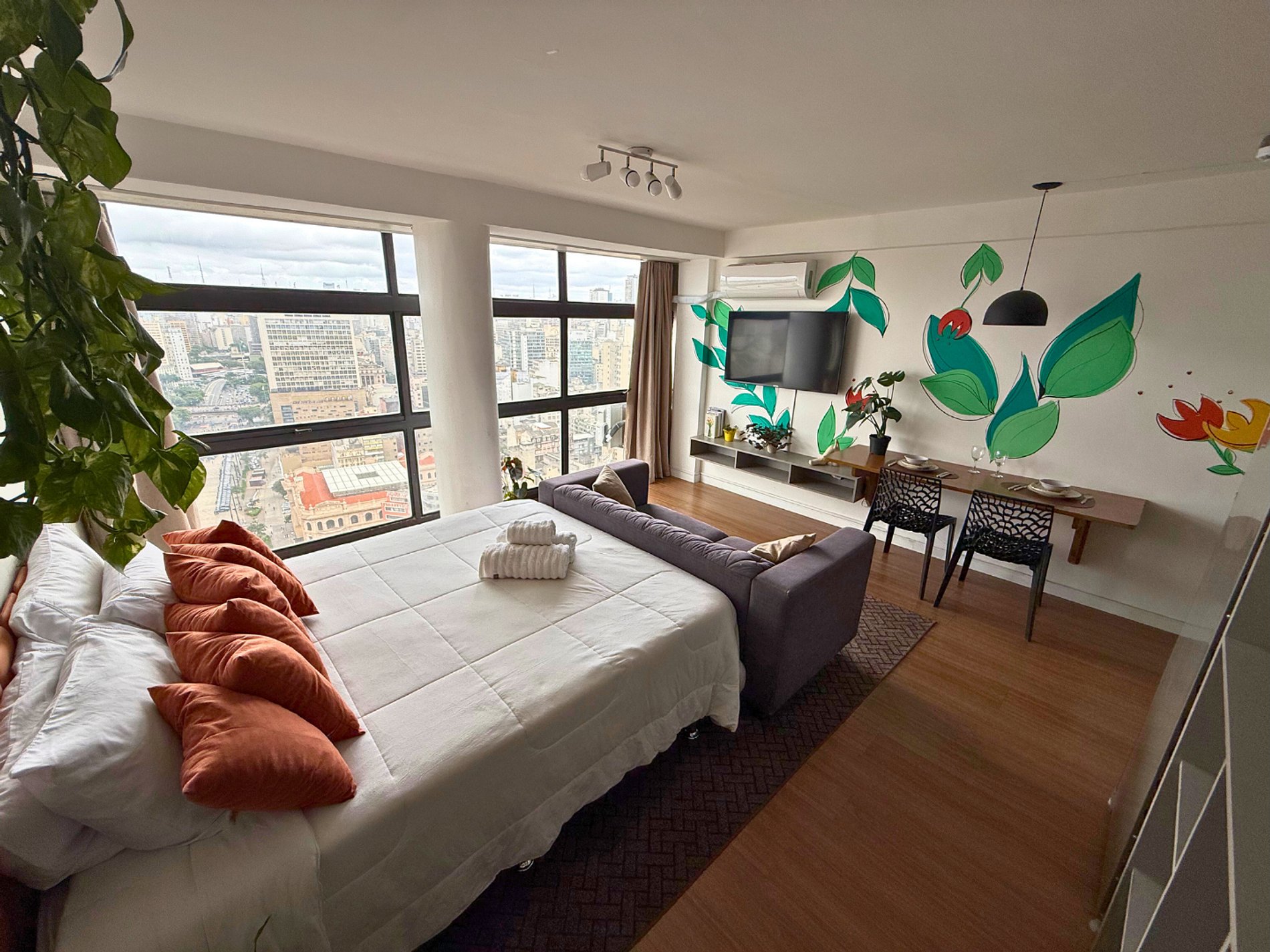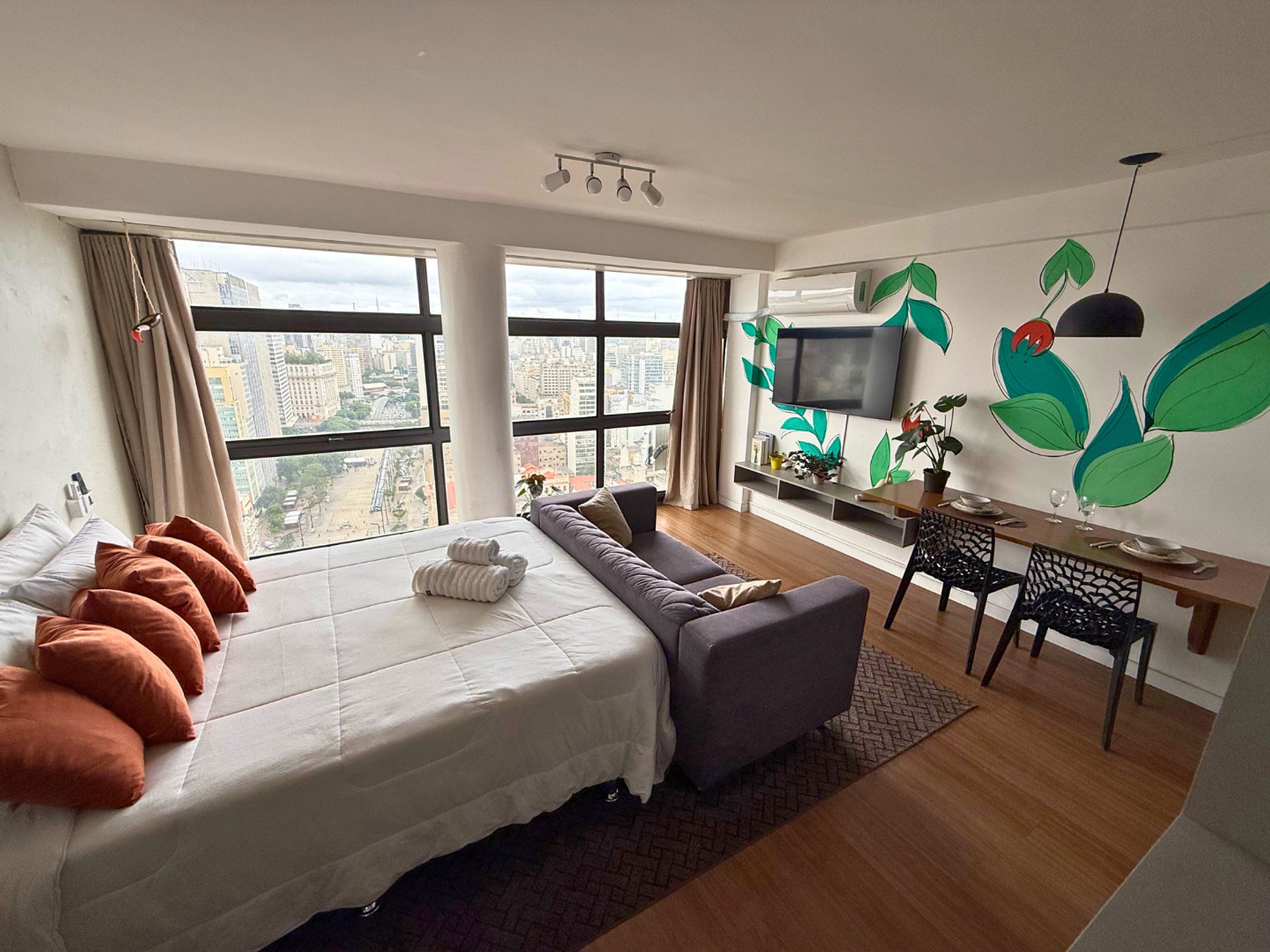 No 39º andar, voltado para o Vale do Anhangabaú, nosso Refúgio Floresta busca trazer a tranquilidade da natureza para o urbano. Apto cheio de comodidades. Dentre elas, destacamos a Smart TV, espaço de trabalho, internet de alta velocidade, cozinha completa com todos utensílios, guarda roupa, amplo banheiro, cama confortável com jogo completo de roupas de cama e banho, além de uma decoração linda composta por um trabalho artístico e diversas plantas naturais espalhadas por todo o apto.