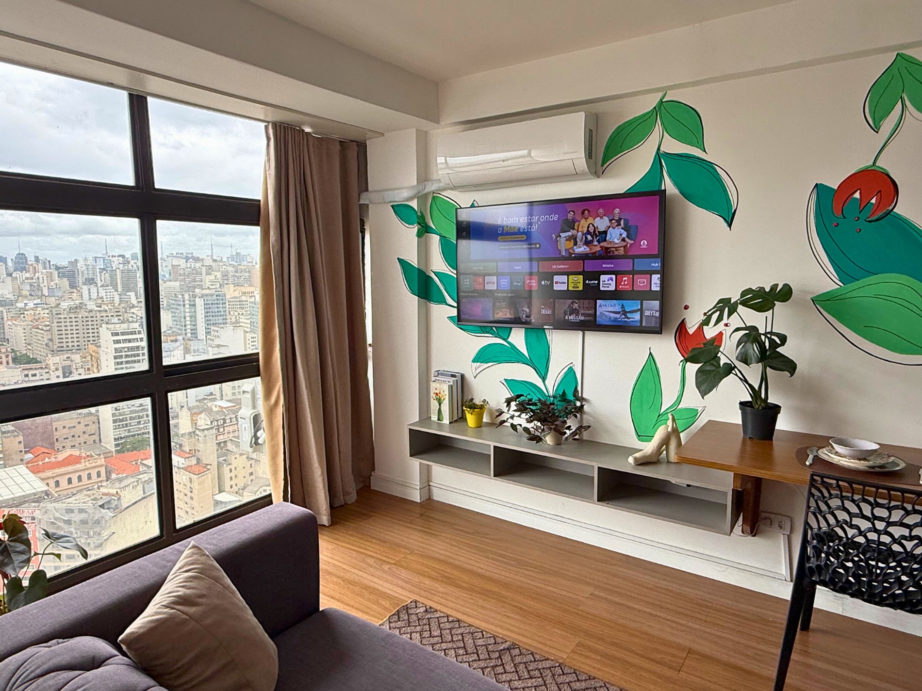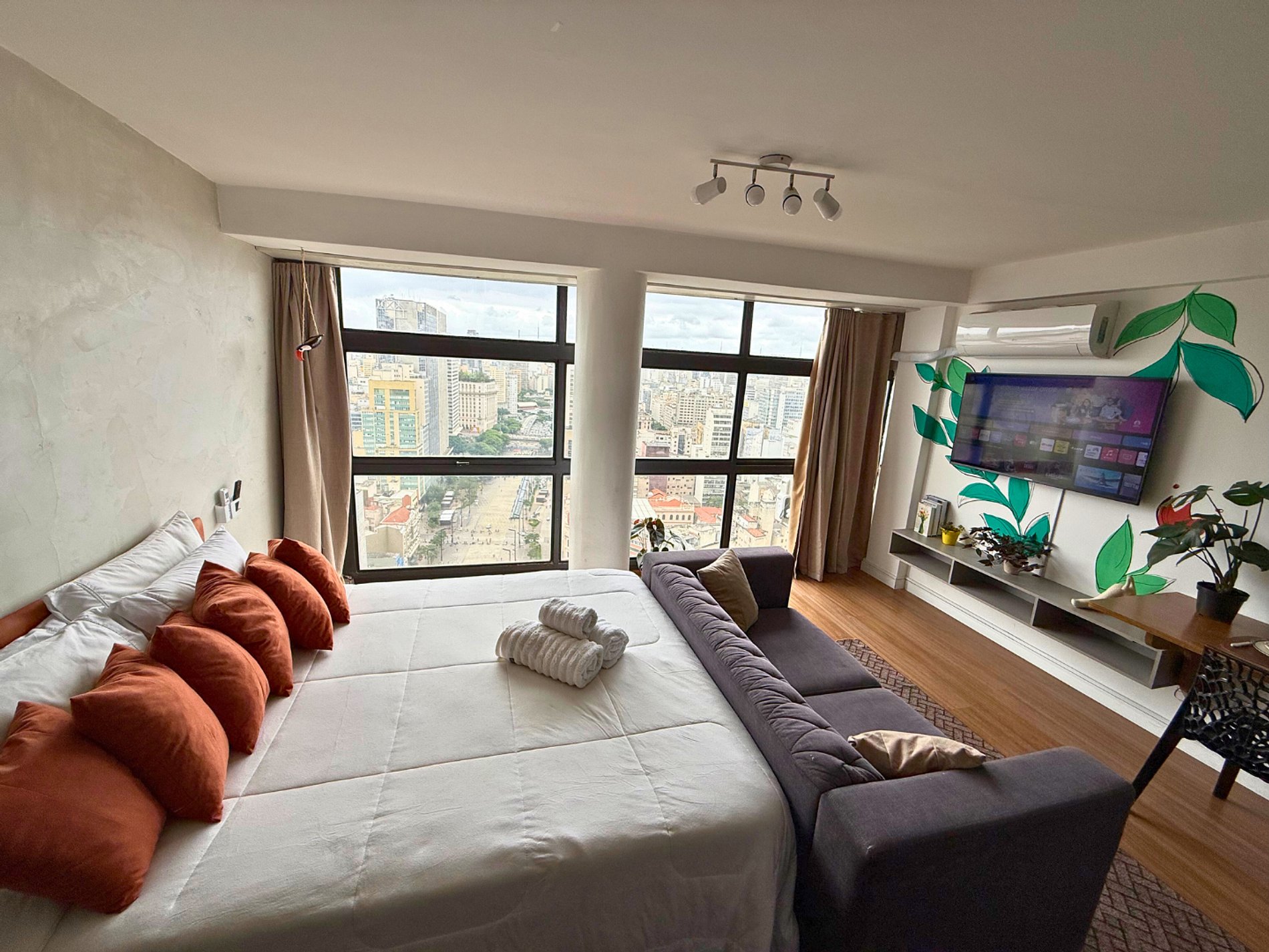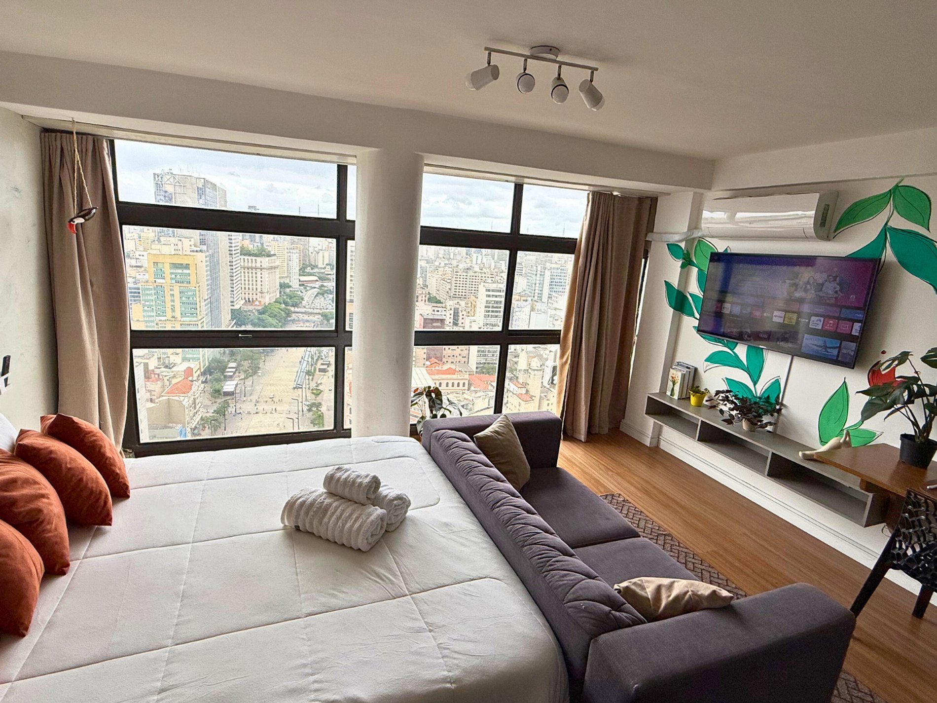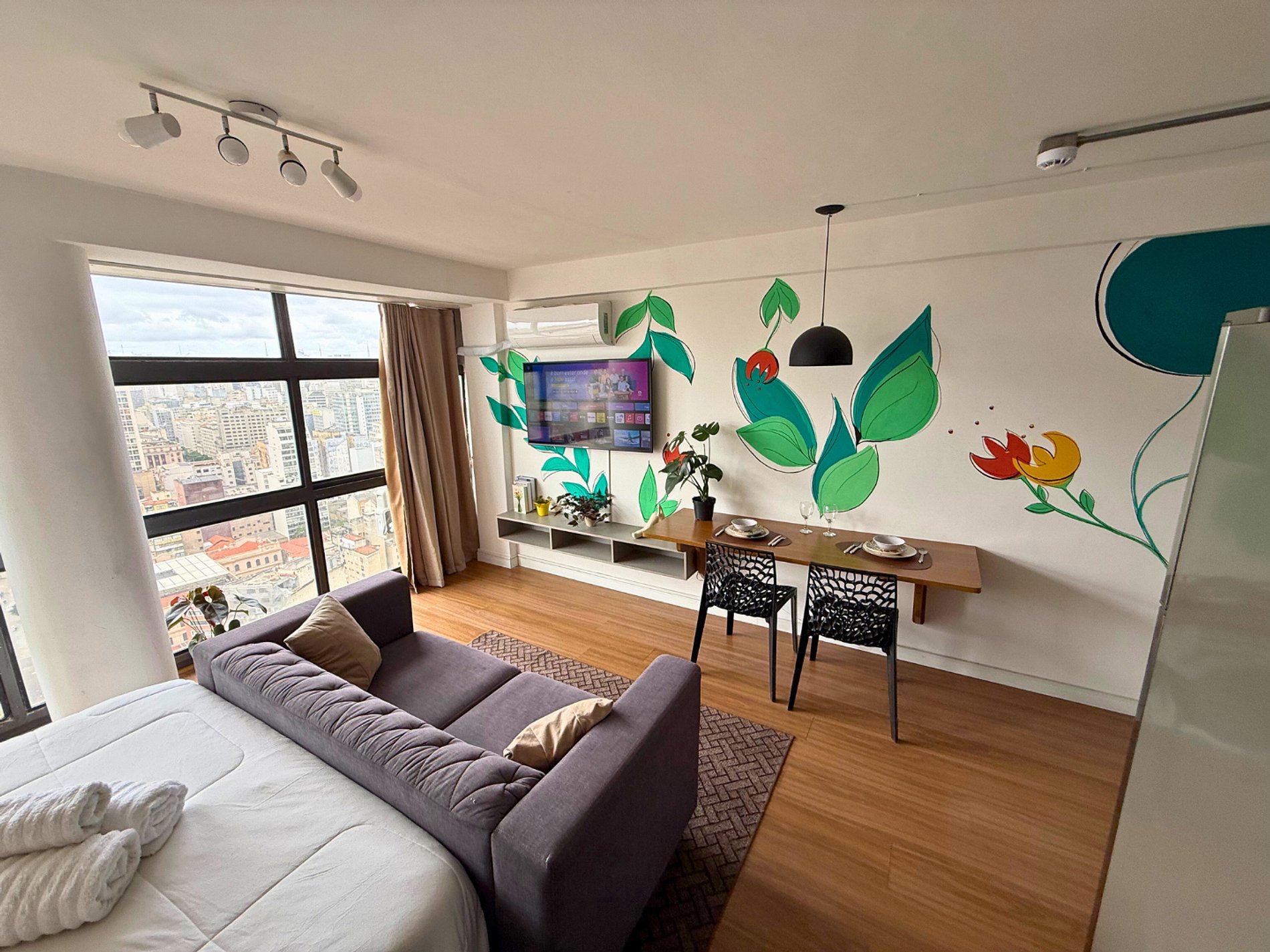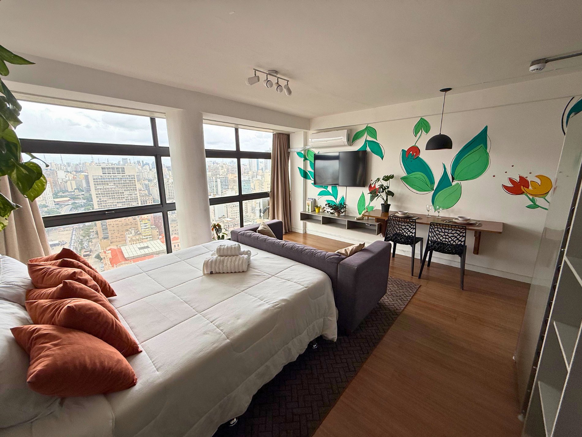 No 39º andar, voltado para o Vale do Anhangabaú, nosso Refúgio Floresta busca trazer a tranquilidade da natureza para o urbano. Apto cheio de comodidades. Dentre elas, destacamos a Smart TV, espaço de trabalho, internet de alta velocidade, cozinha completa com todos utensílios, guarda roupa, amplo banheiro, cama confortável com jogo completo de roupas de cama e banho, além de uma decoração linda composta por um trabalho artístico e diversas plantas naturais espalhadas por todo o apto.