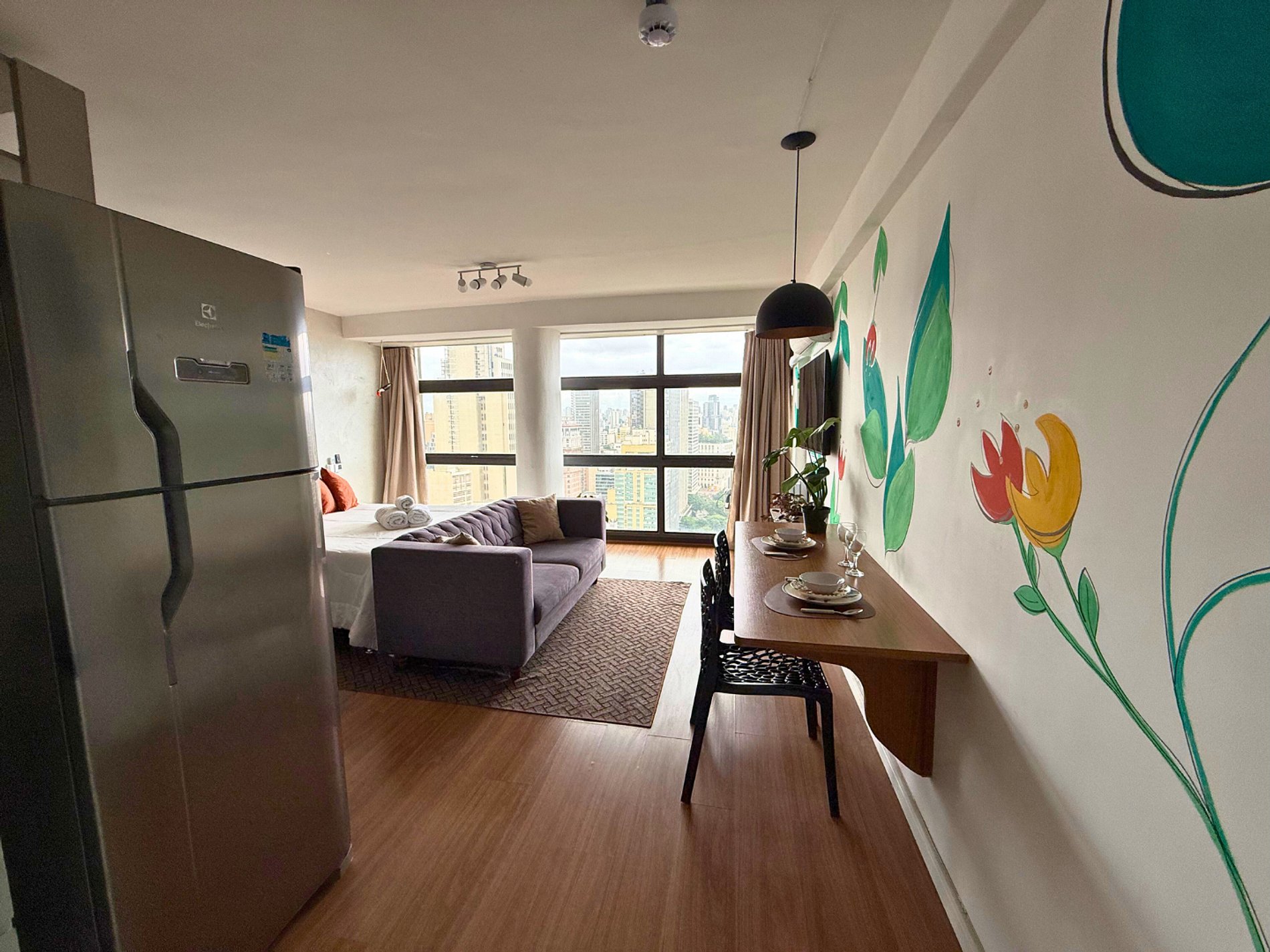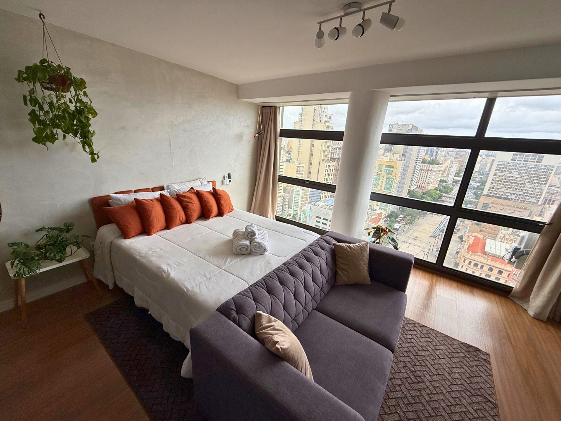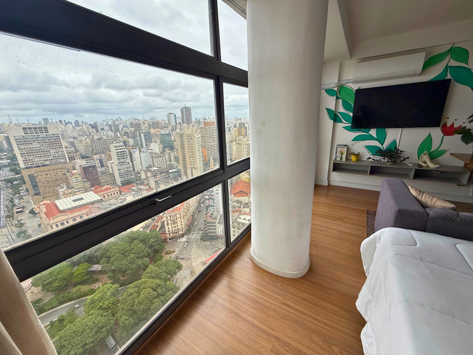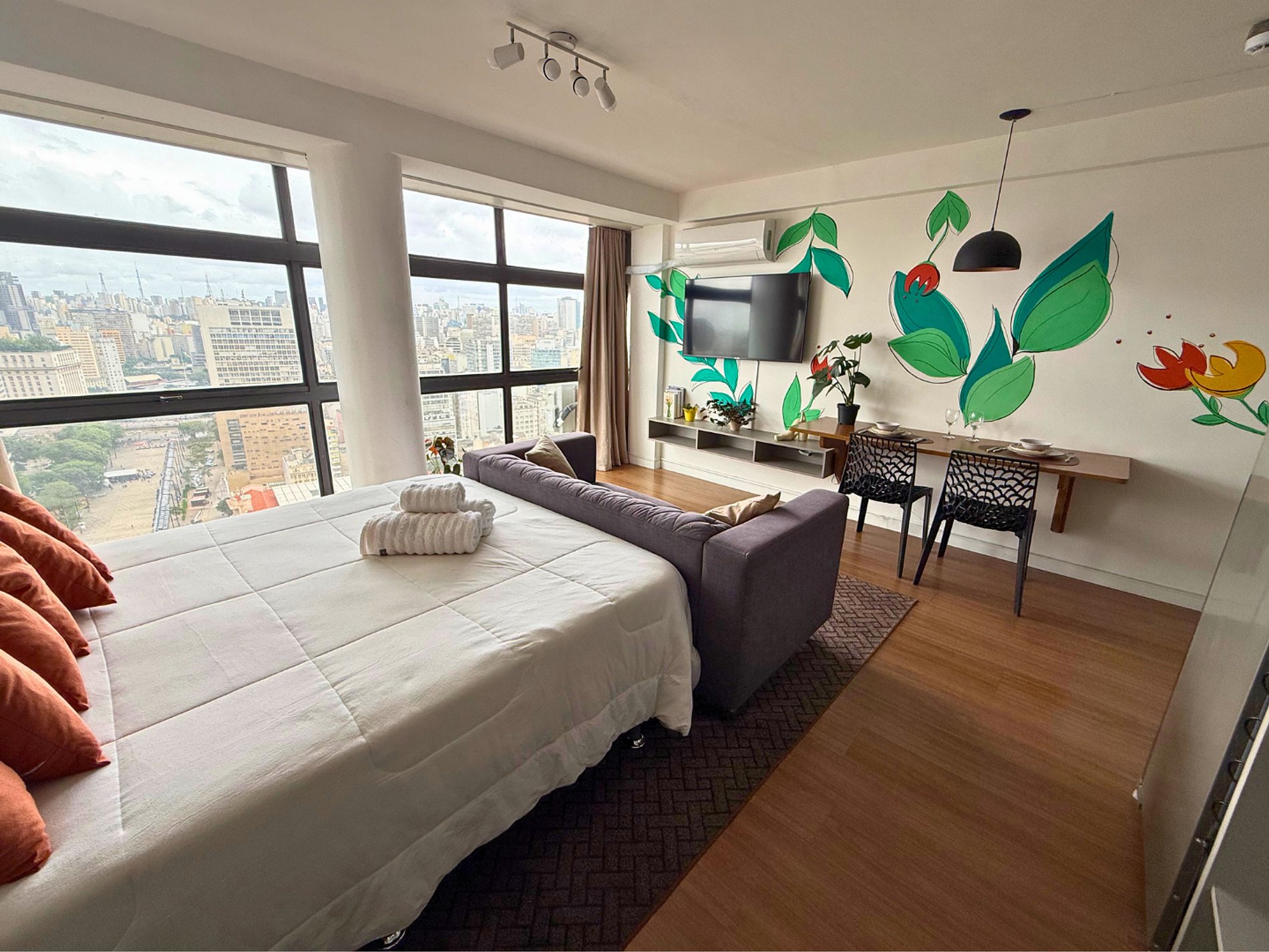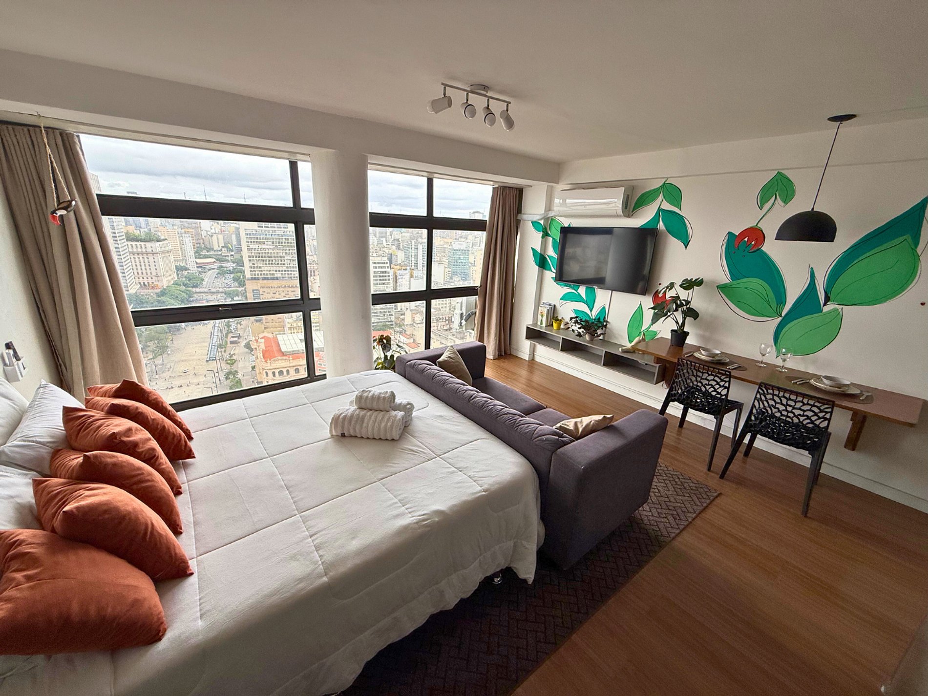 No 39º andar, voltado para o Vale do Anhangabaú, nosso Refúgio Floresta busca trazer a tranquilidade da natureza para o urbano. Apto cheio de comodidades. Dentre elas, destacamos a Smart TV, espaço de trabalho, internet de alta velocidade, cozinha completa com todos utensílios, guarda roupa, amplo banheiro, cama confortável com jogo completo de roupas de cama e banho, além de uma decoração linda composta por um trabalho artístico e diversas plantas naturais espalhadas por todo o apto.