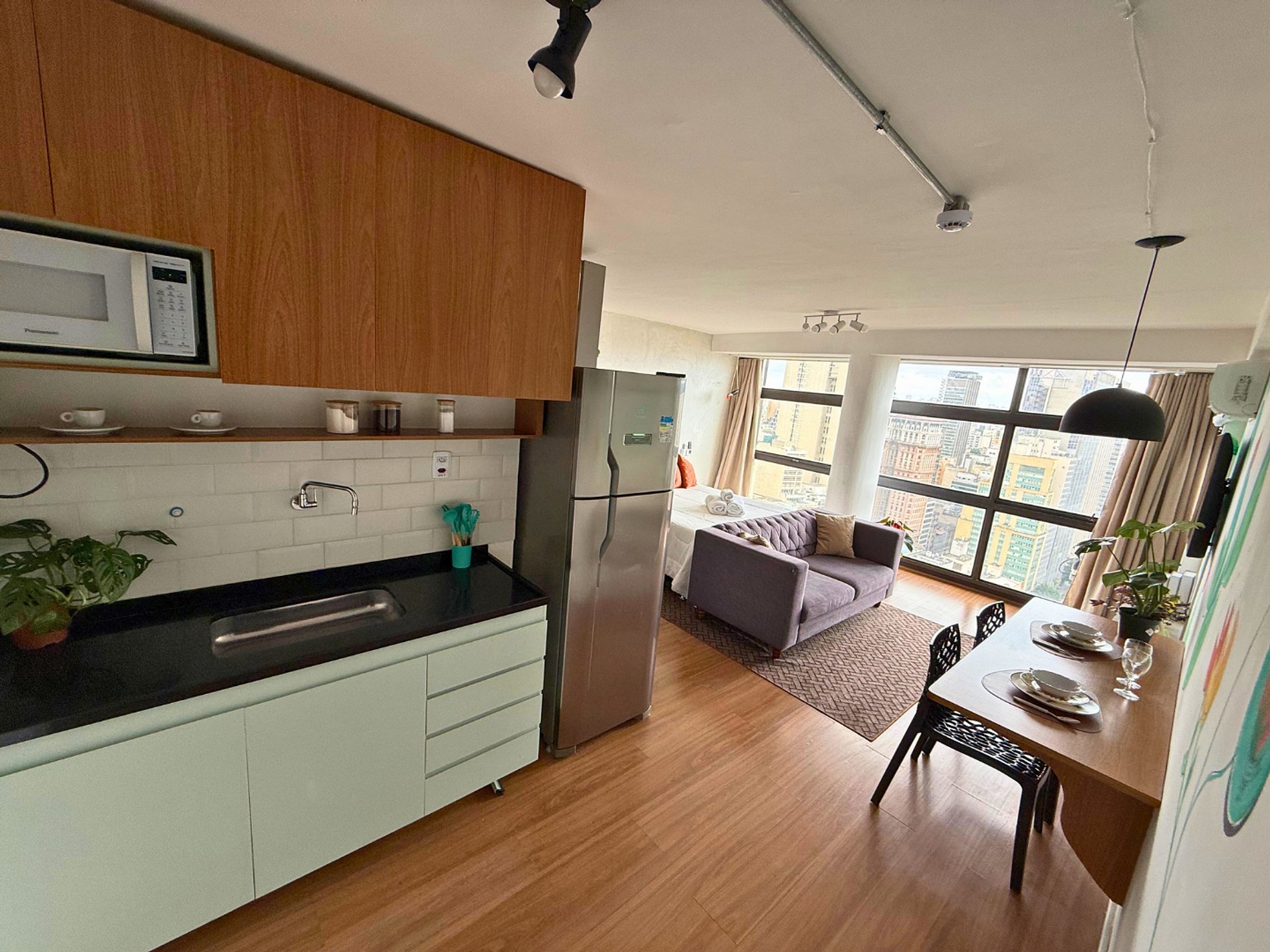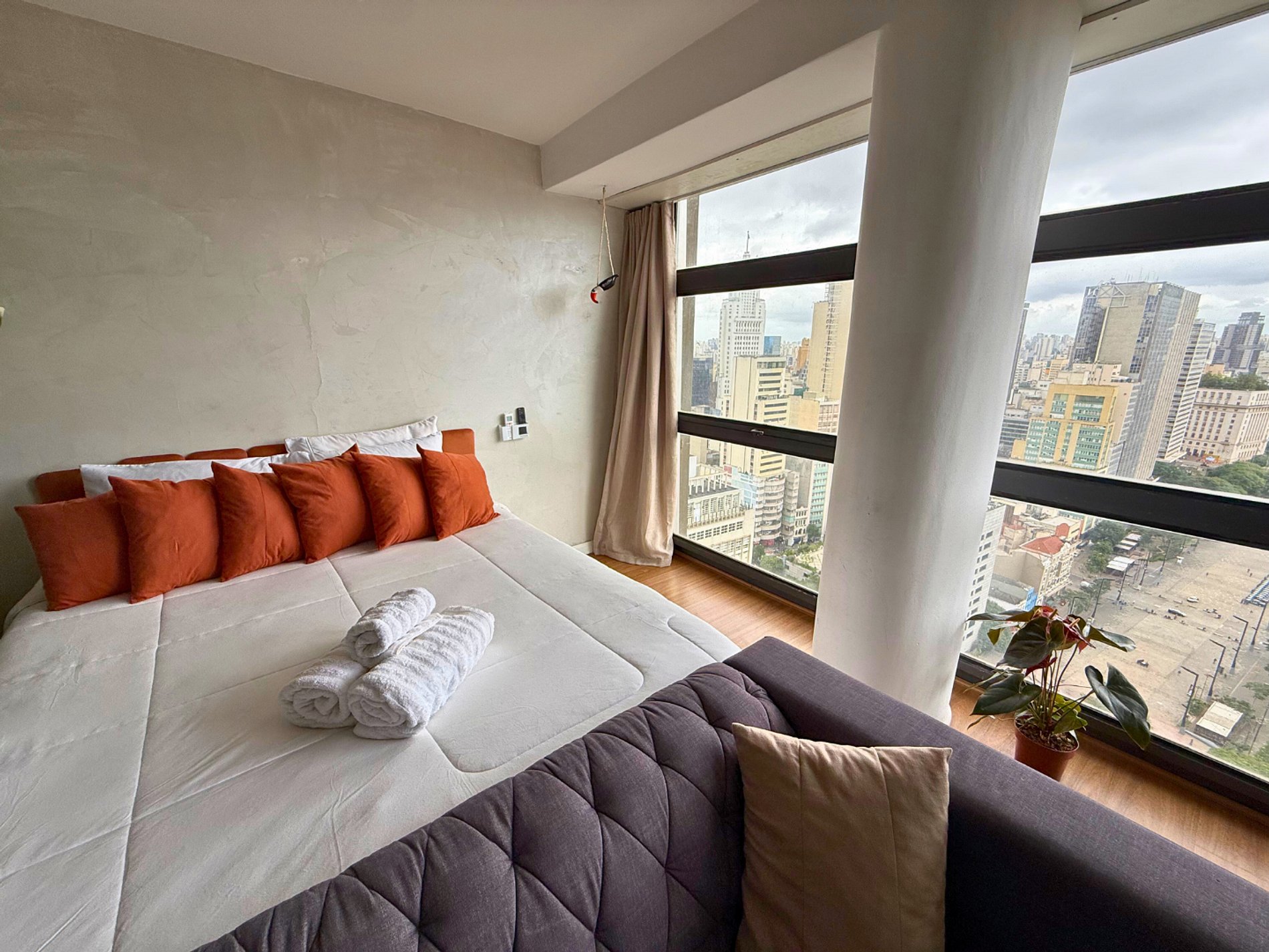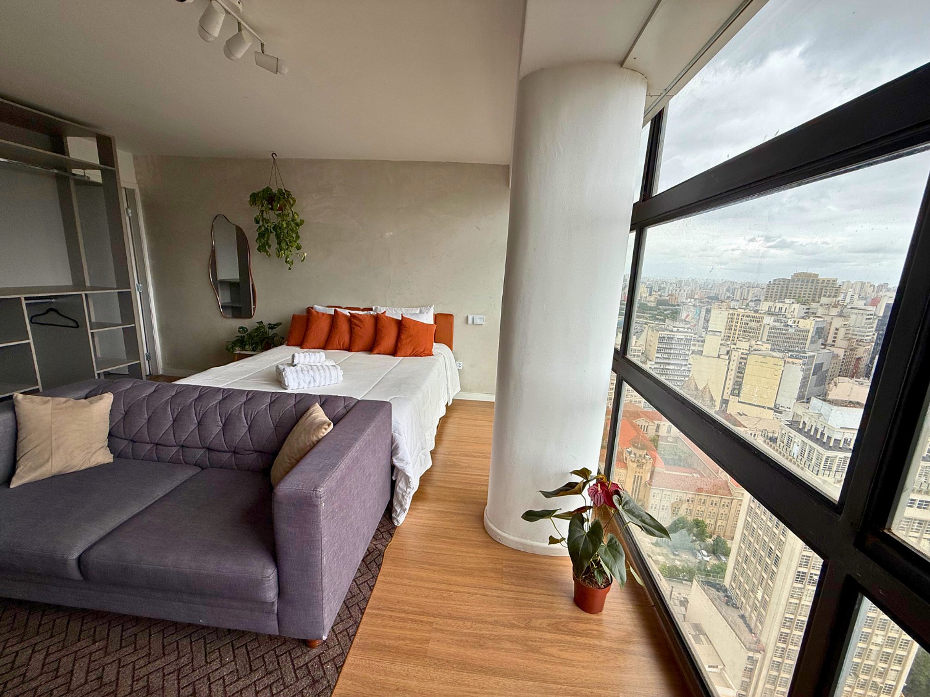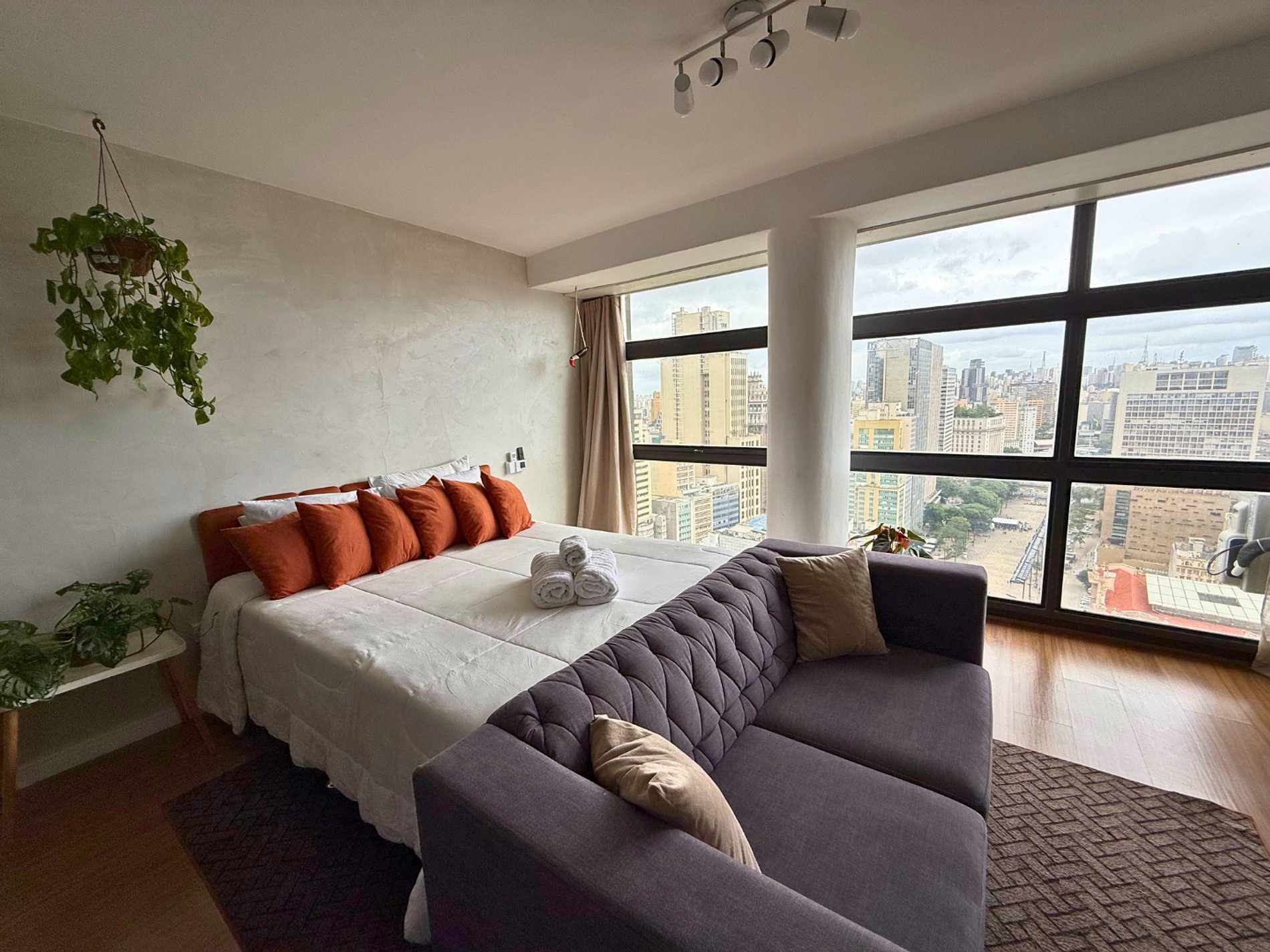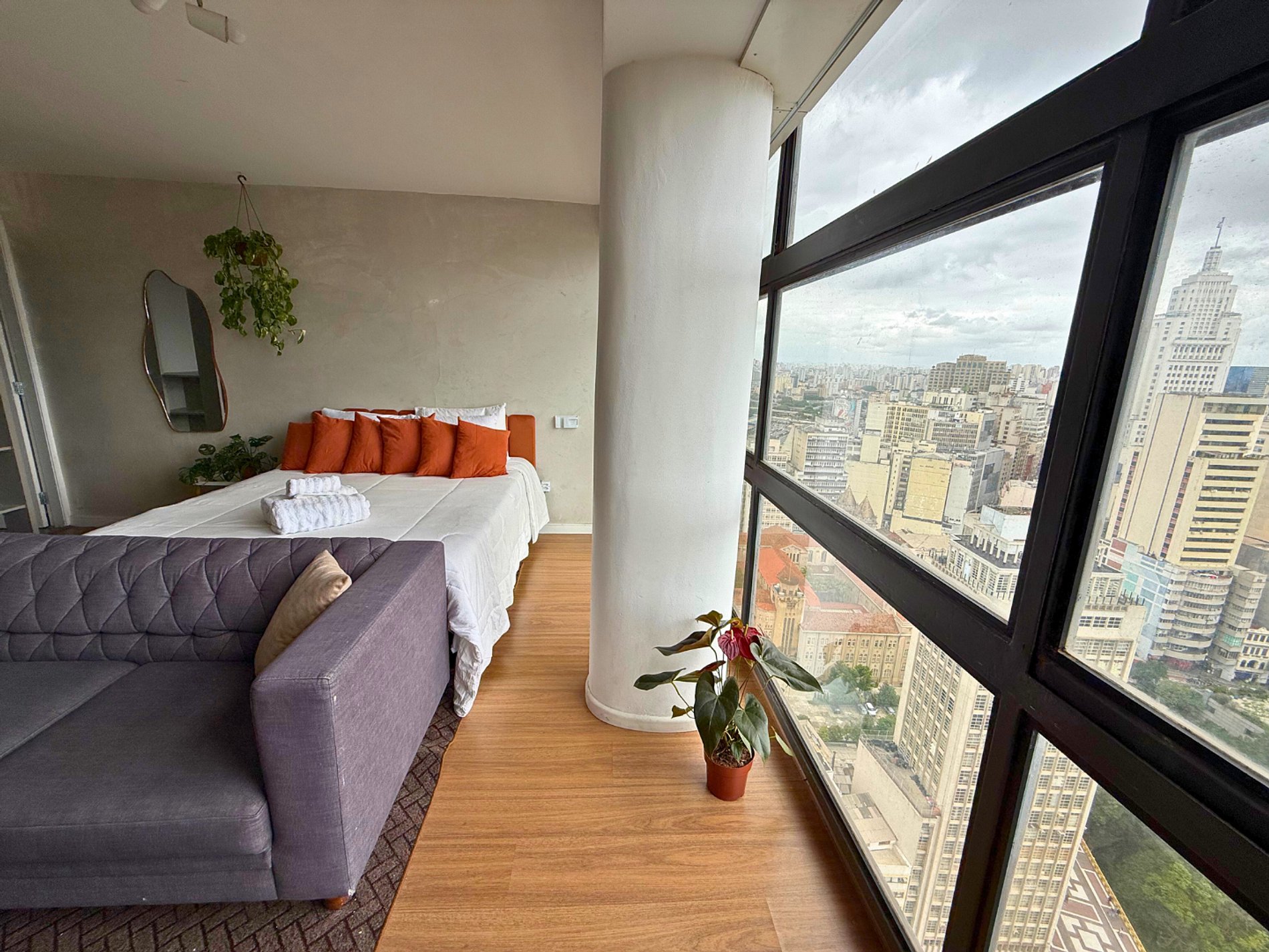 No 39º andar, voltado para o Vale do Anhangabaú, nosso Refúgio Floresta busca trazer a tranquilidade da natureza para o urbano. Apto cheio de comodidades. Dentre elas, destacamos a Smart TV, espaço de trabalho, internet de alta velocidade, cozinha completa com todos utensílios, guarda roupa, amplo banheiro, cama confortável com jogo completo de roupas de cama e banho, além de uma decoração linda composta por um trabalho artístico e diversas plantas naturais espalhadas por todo o apto.