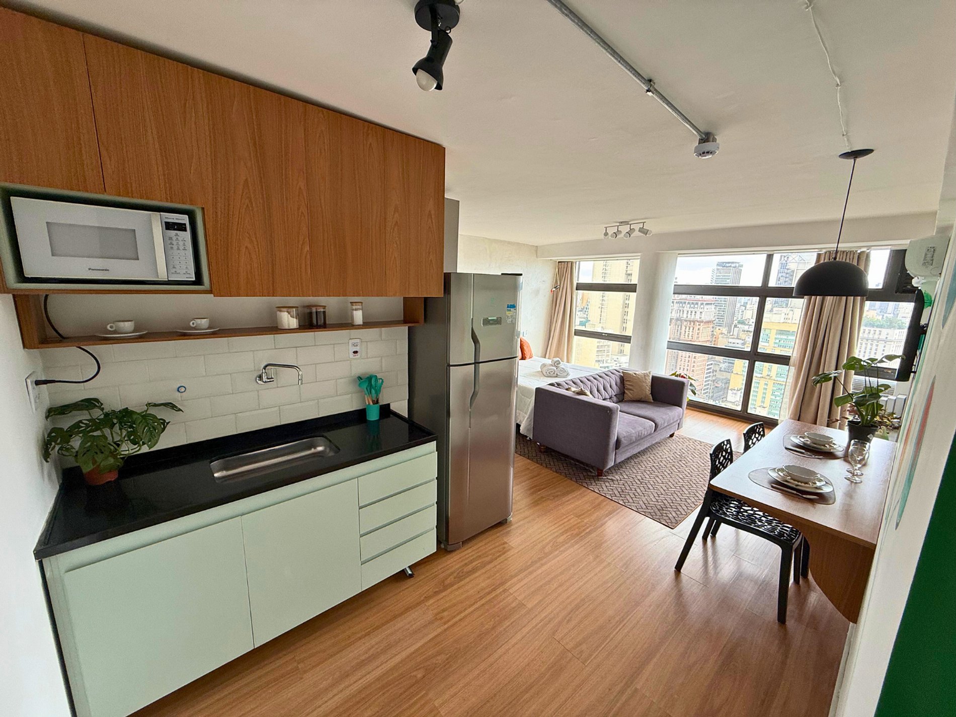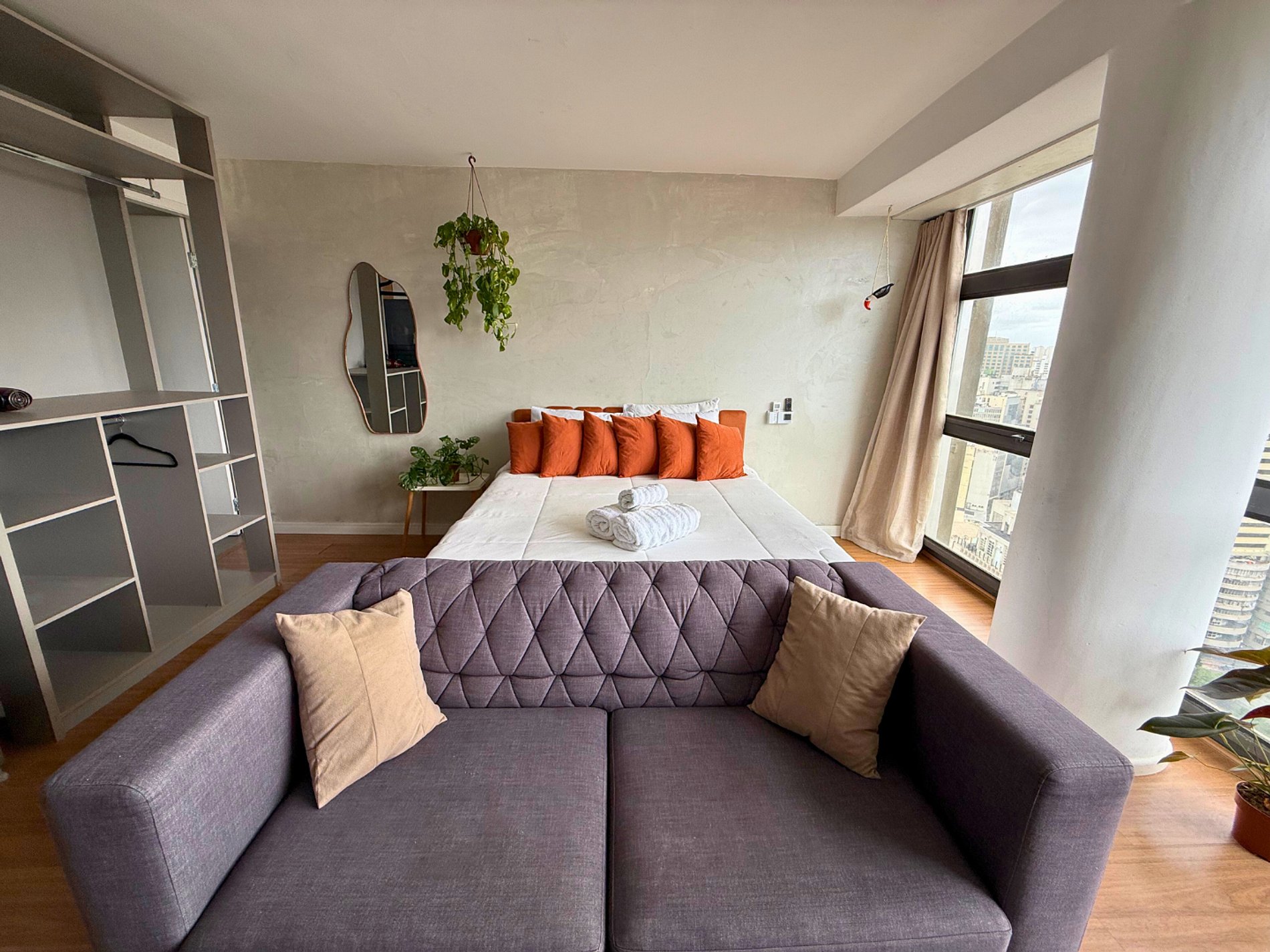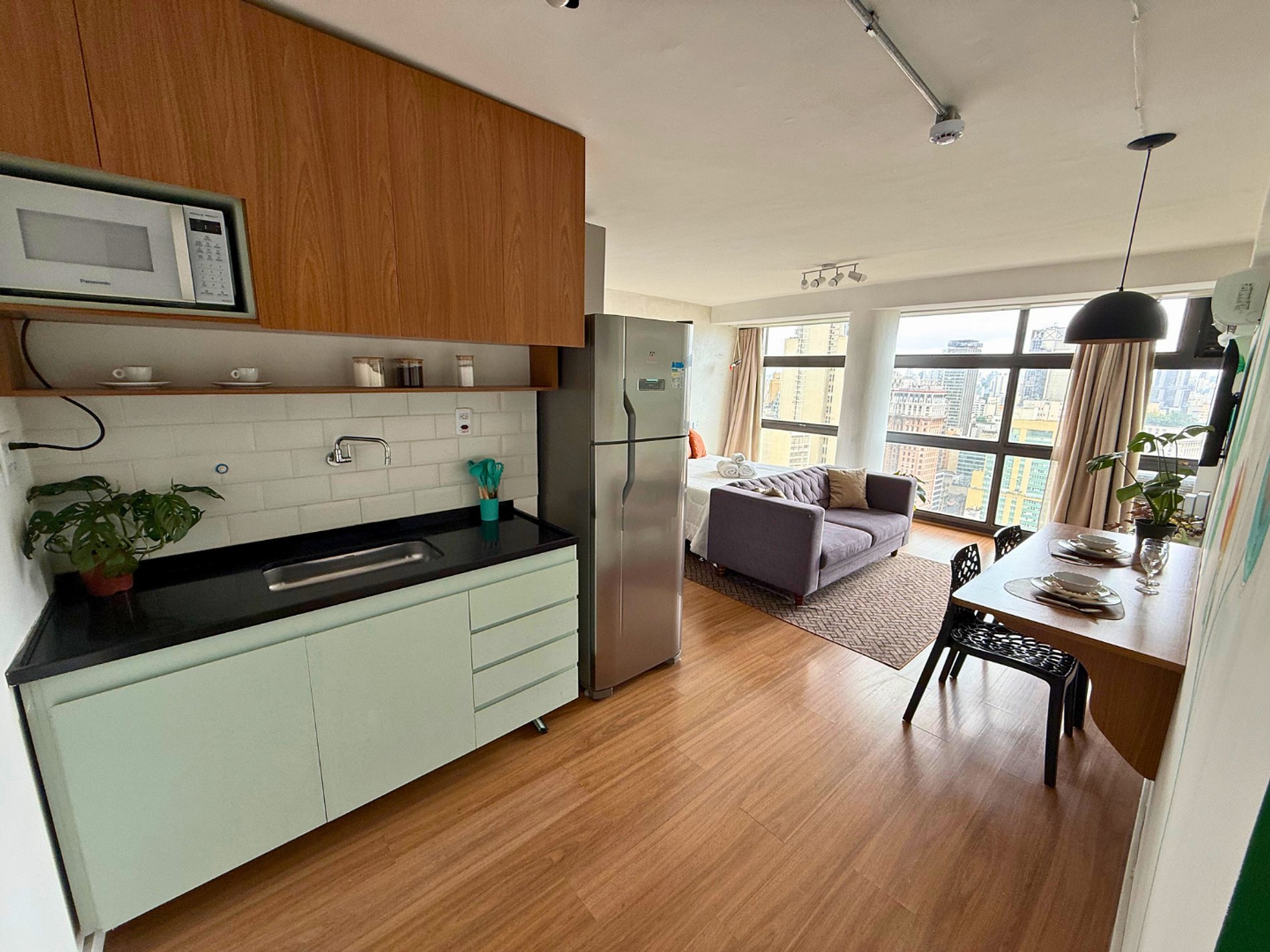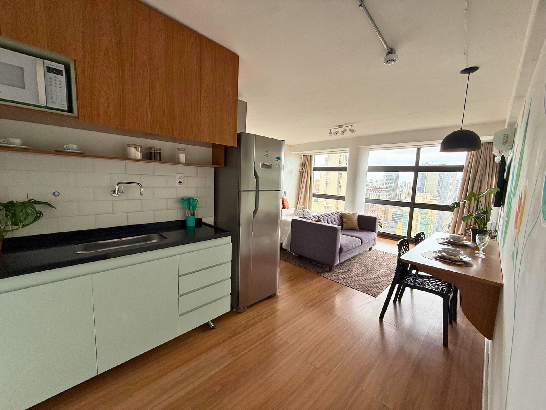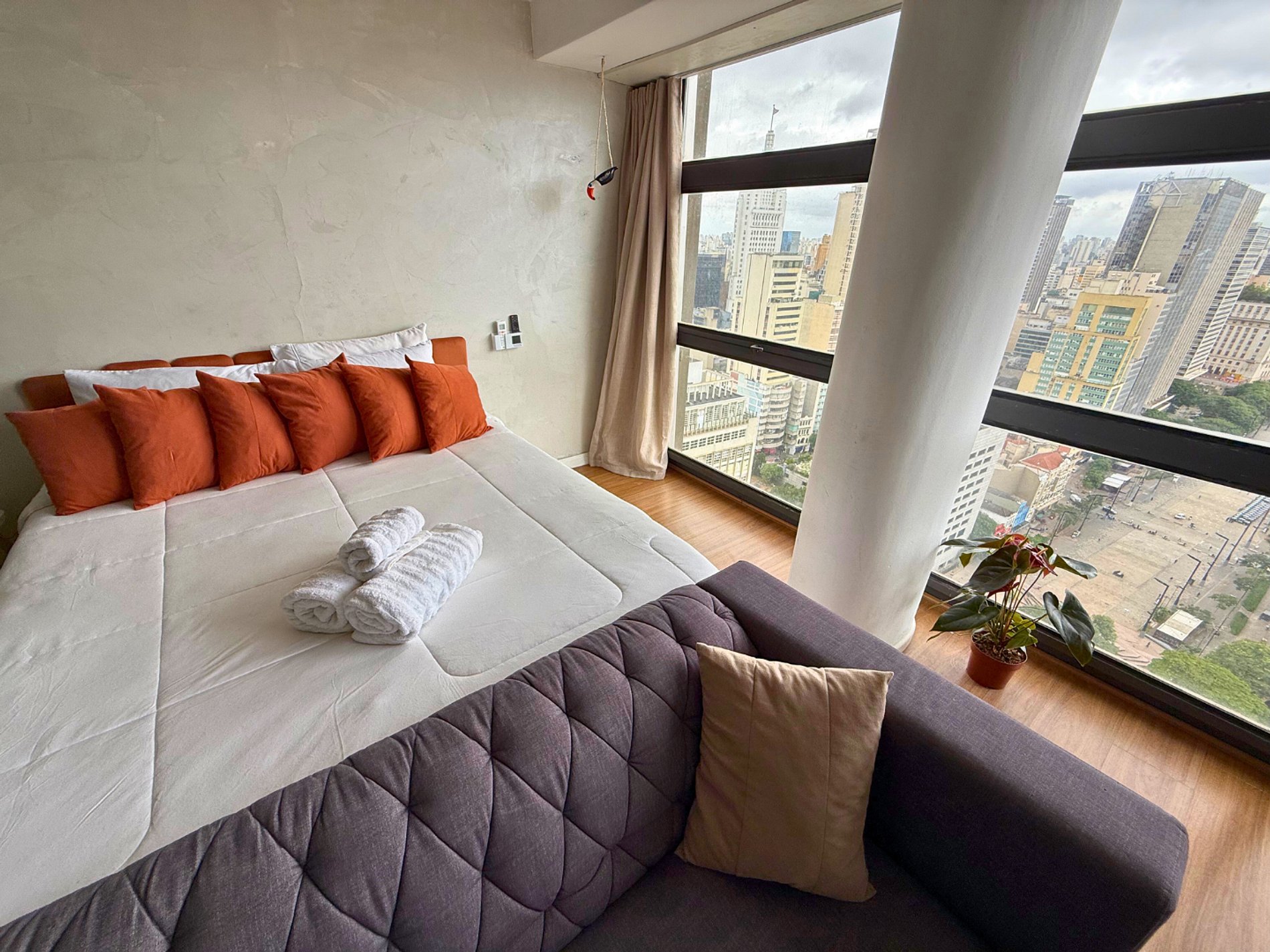 No 39º andar, voltado para o Vale do Anhangabaú, nosso Refúgio Floresta busca trazer a tranquilidade da natureza para o urbano. Apto cheio de comodidades. Dentre elas, destacamos a Smart TV, espaço de trabalho, internet de alta velocidade, cozinha completa com todos utensílios, guarda roupa, amplo banheiro, cama confortável com jogo completo de roupas de cama e banho, além de uma decoração linda composta por um trabalho artístico e diversas plantas naturais espalhadas por todo o apto.