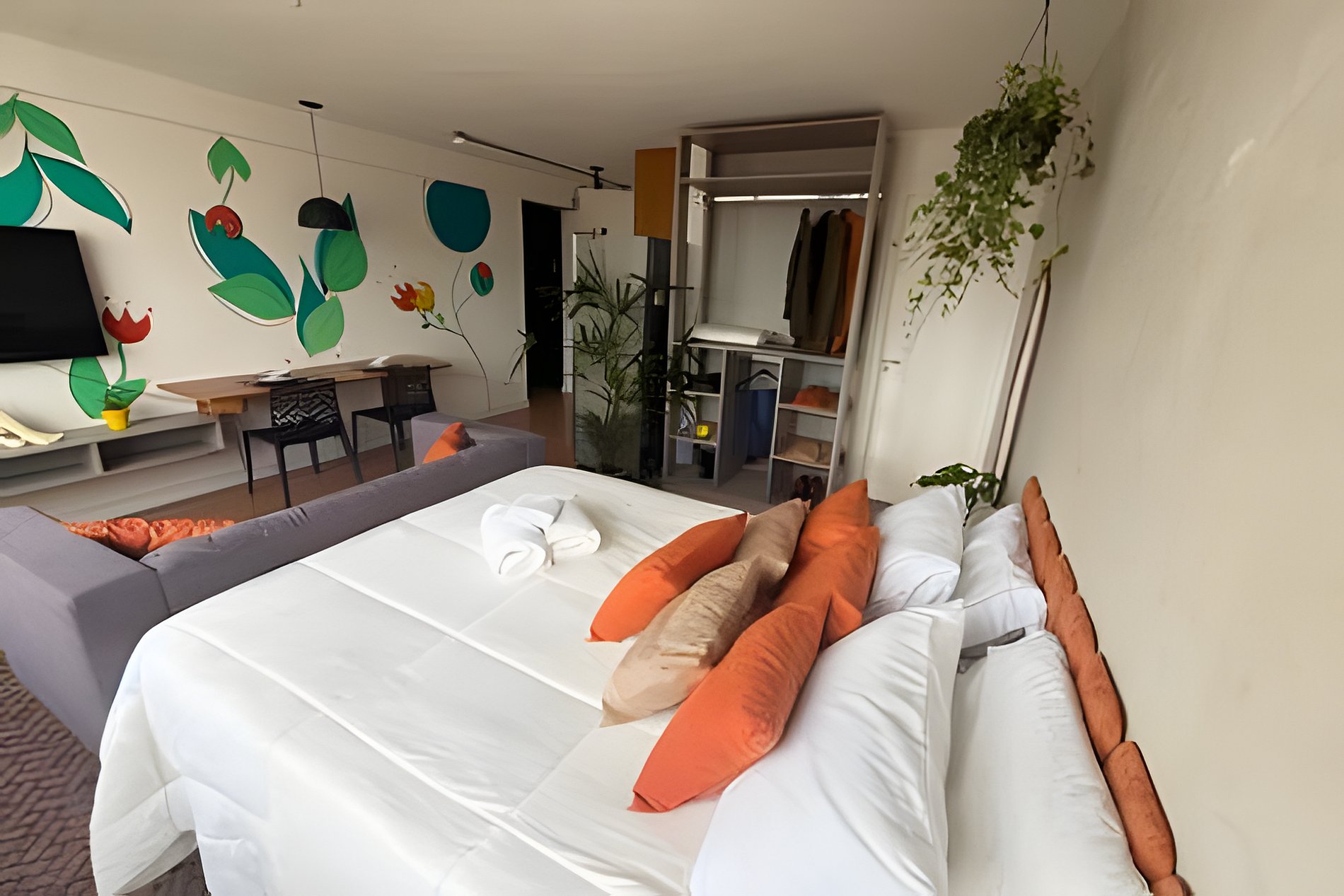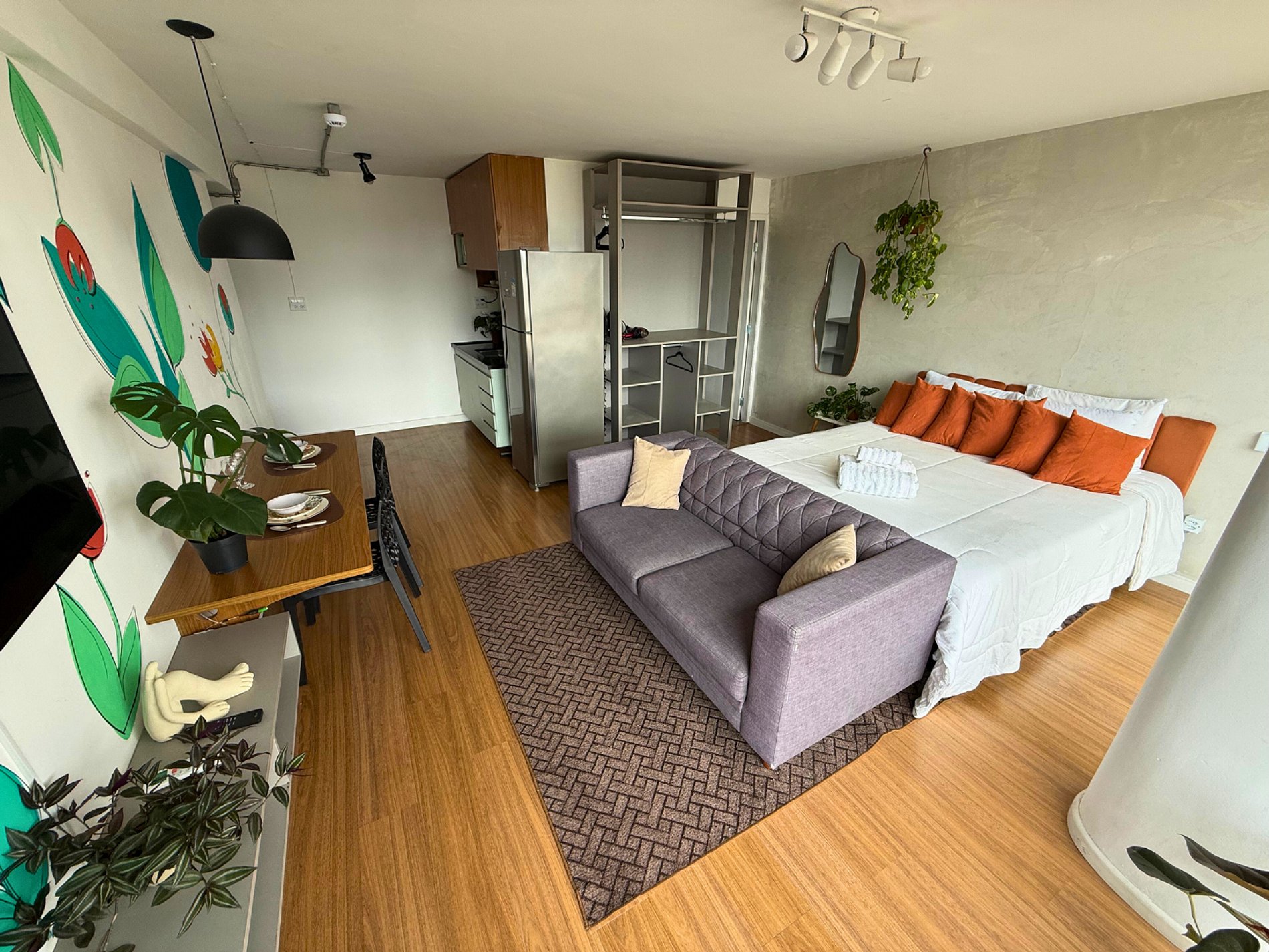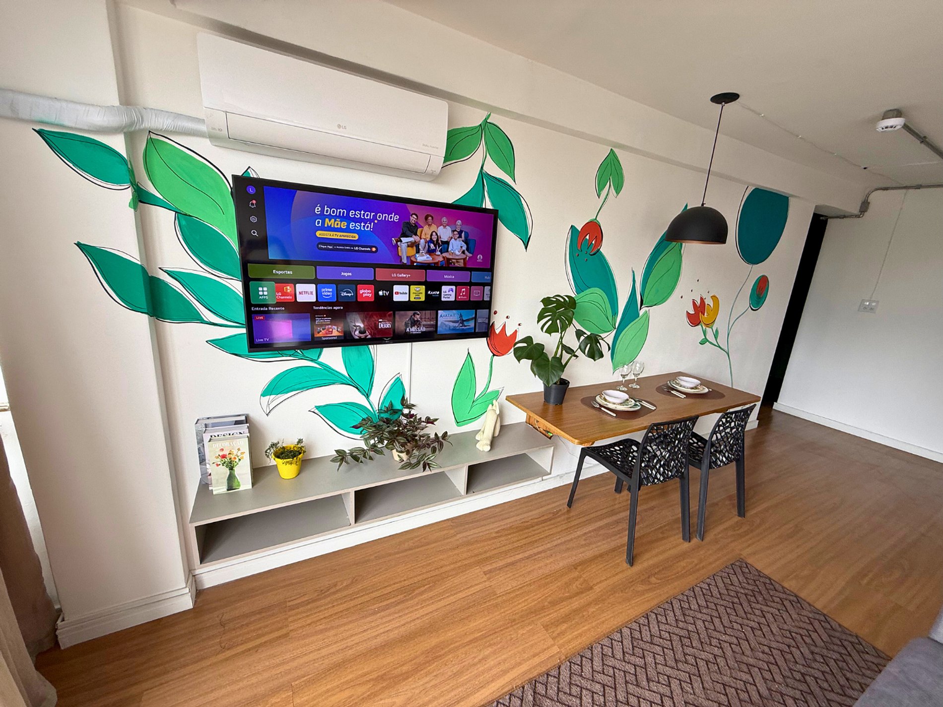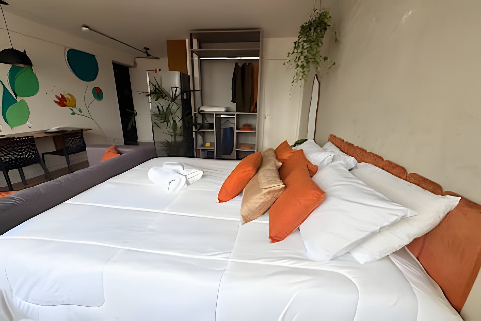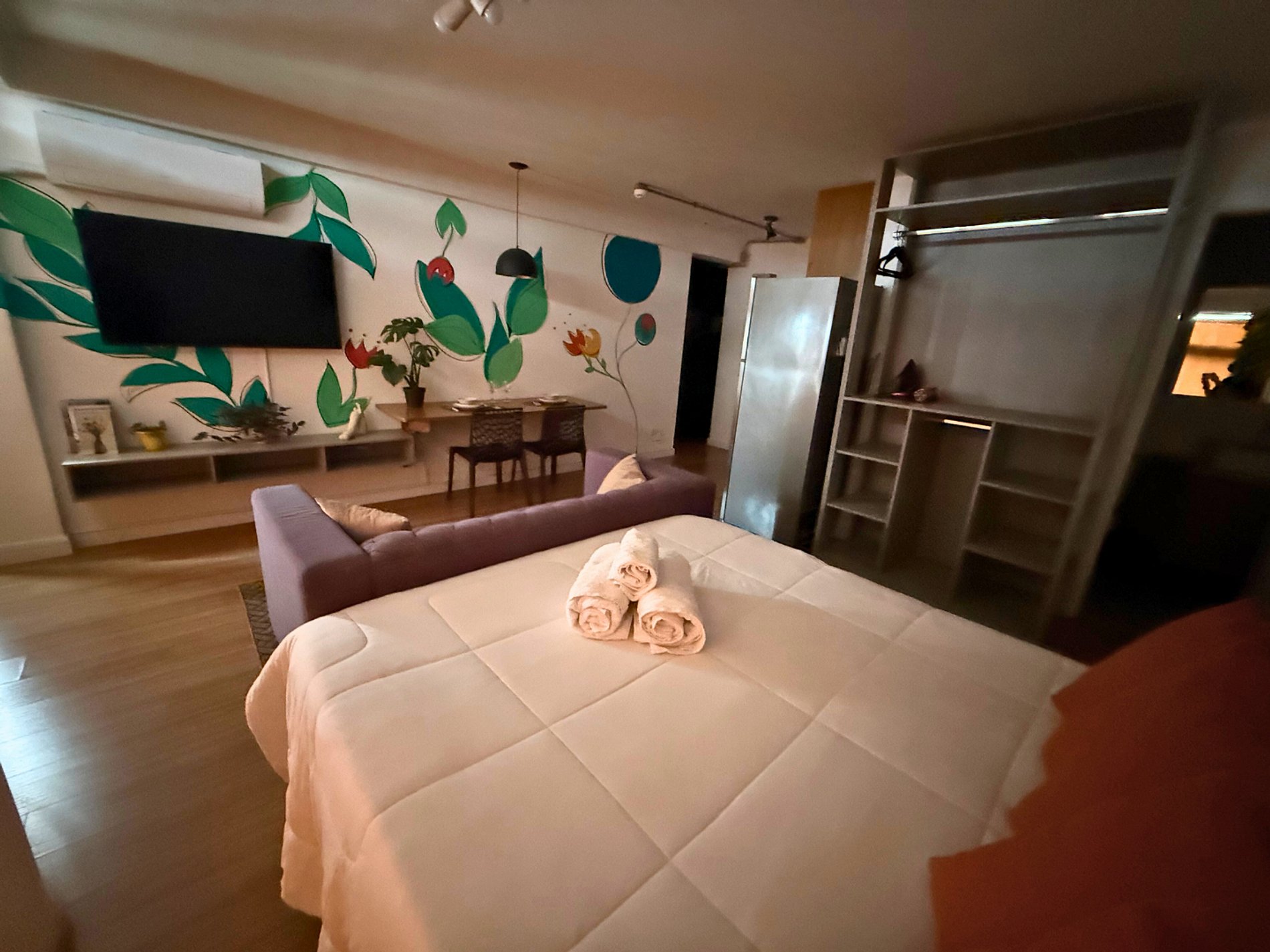 No 39º andar, voltado para o Vale do Anhangabaú, nosso Refúgio Floresta busca trazer a tranquilidade da natureza para o urbano. Apto cheio de comodidades. Dentre elas, destacamos a Smart TV, espaço de trabalho, internet de alta velocidade, cozinha completa com todos utensílios, guarda roupa, amplo banheiro, cama confortável com jogo completo de roupas de cama e banho, além de uma decoração linda composta por um trabalho artístico e diversas plantas naturais espalhadas por todo o apto.