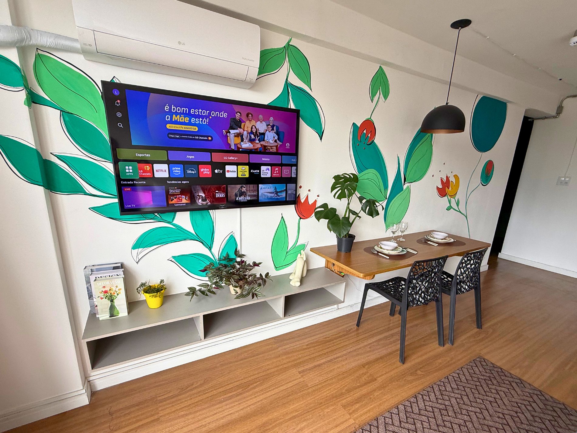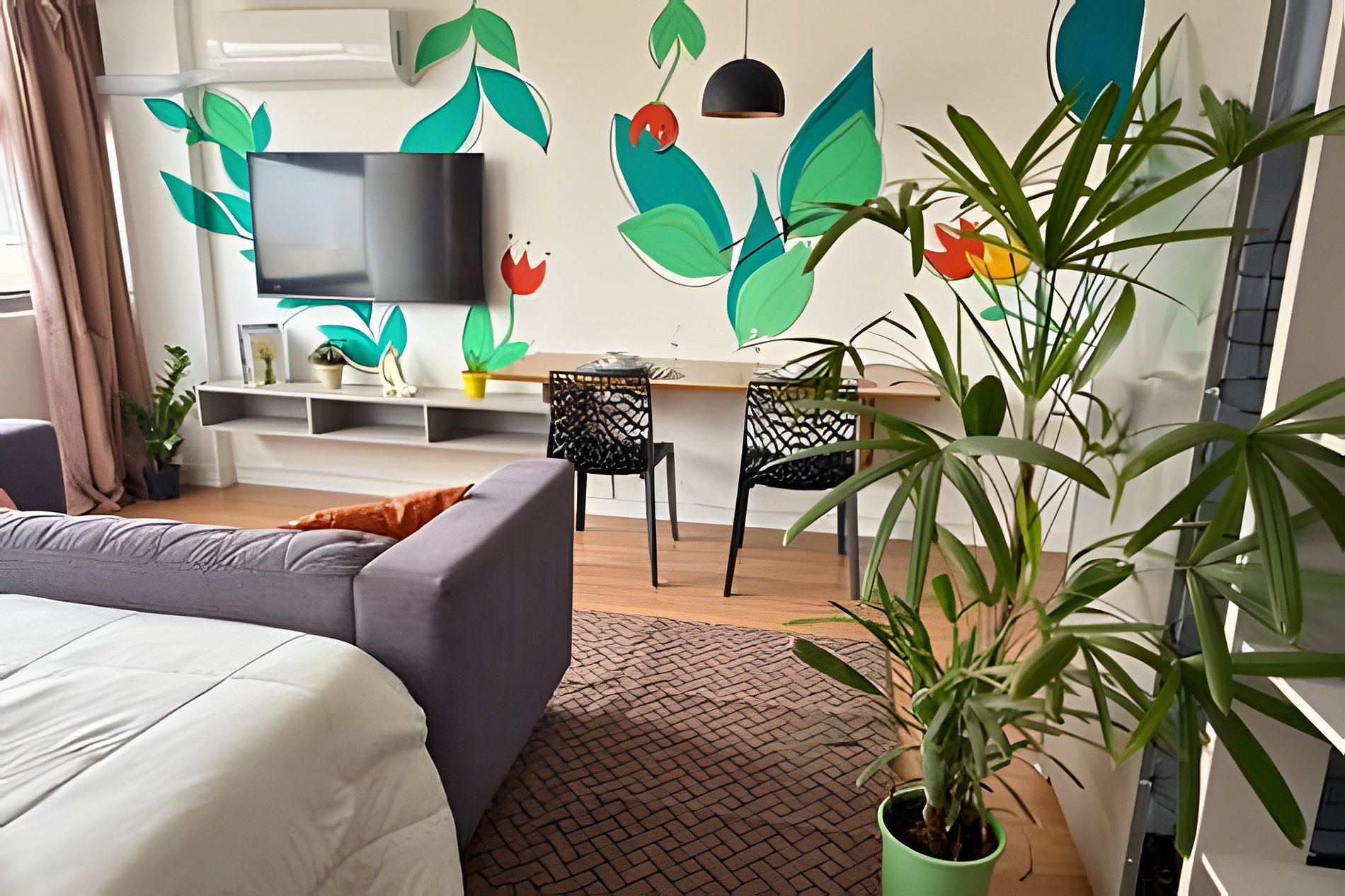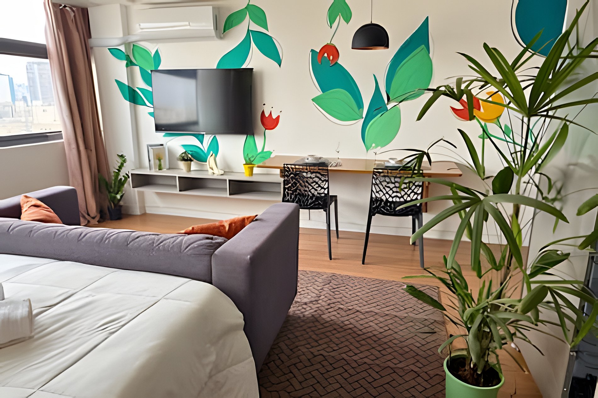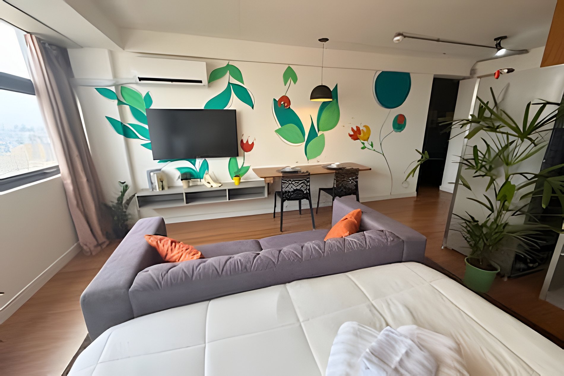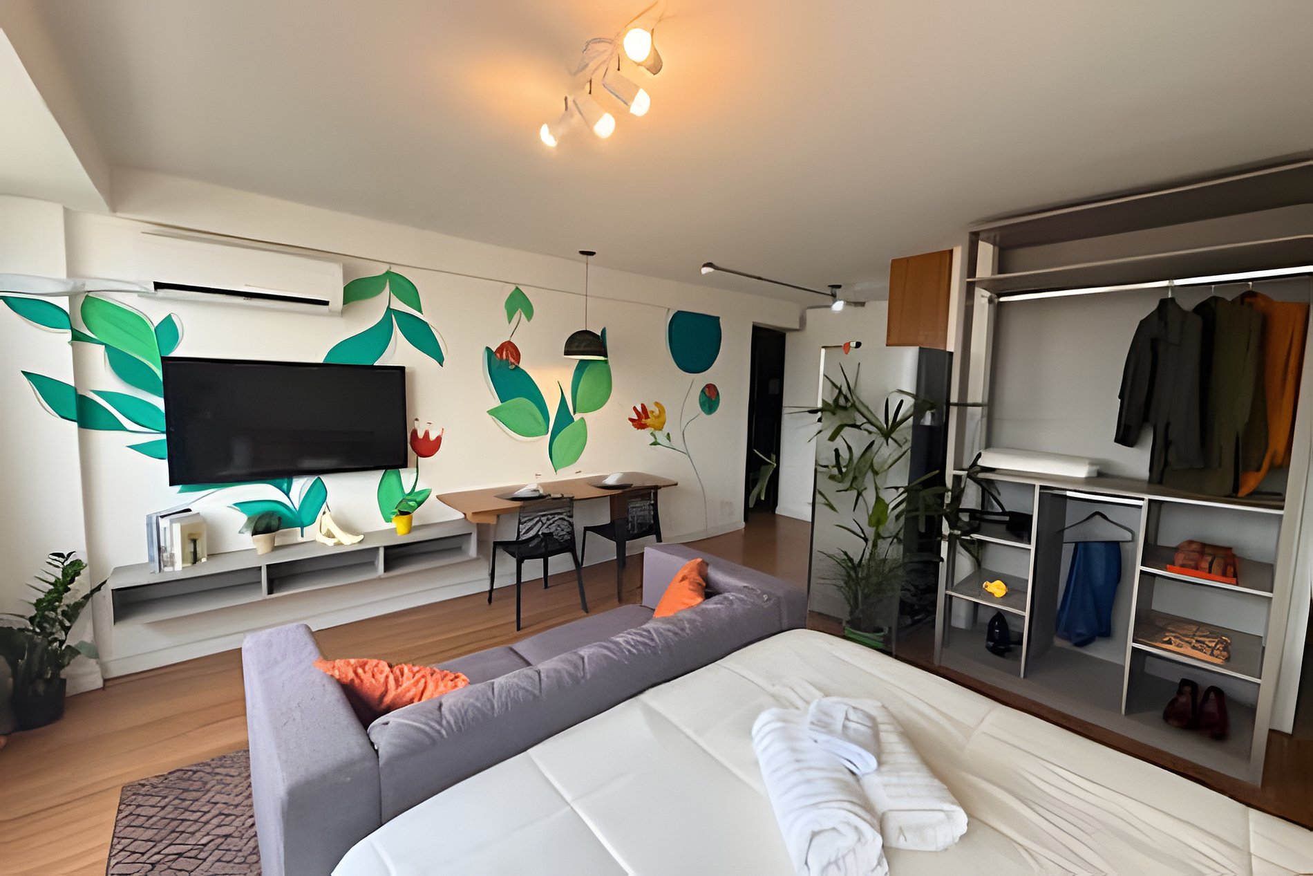 No 39º andar, voltado para o Vale do Anhangabaú, nosso Refúgio Floresta busca trazer a tranquilidade da natureza para o urbano. Apto cheio de comodidades. Dentre elas, destacamos a Smart TV, espaço de trabalho, internet de alta velocidade, cozinha completa com todos utensílios, guarda roupa, amplo banheiro, cama confortável com jogo completo de roupas de cama e banho, além de uma decoração linda composta por um trabalho artístico e diversas plantas naturais espalhadas por todo o apto.