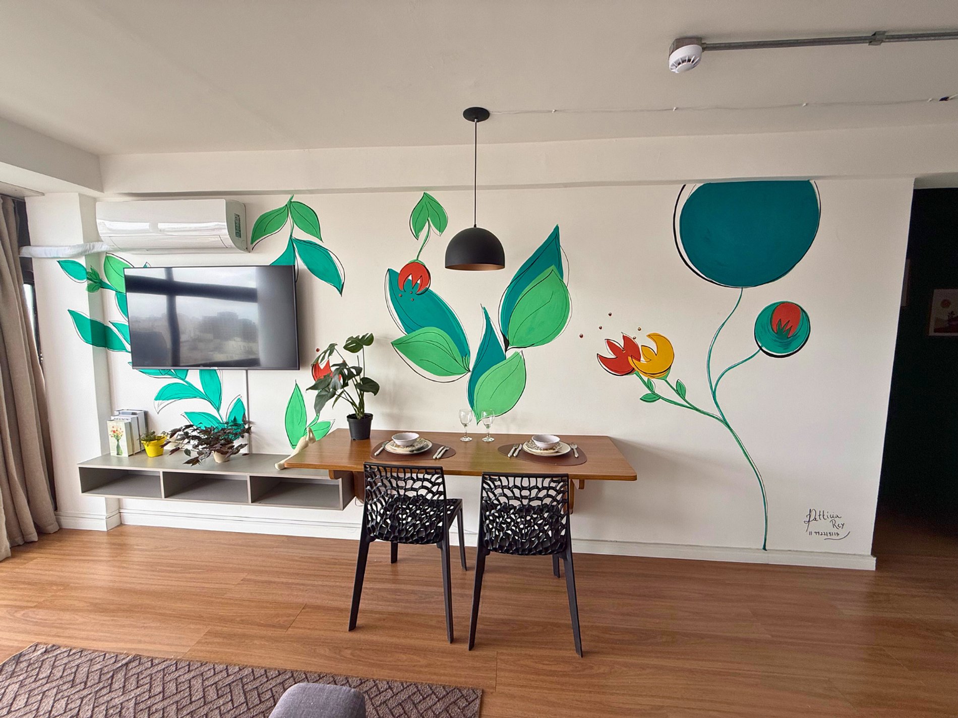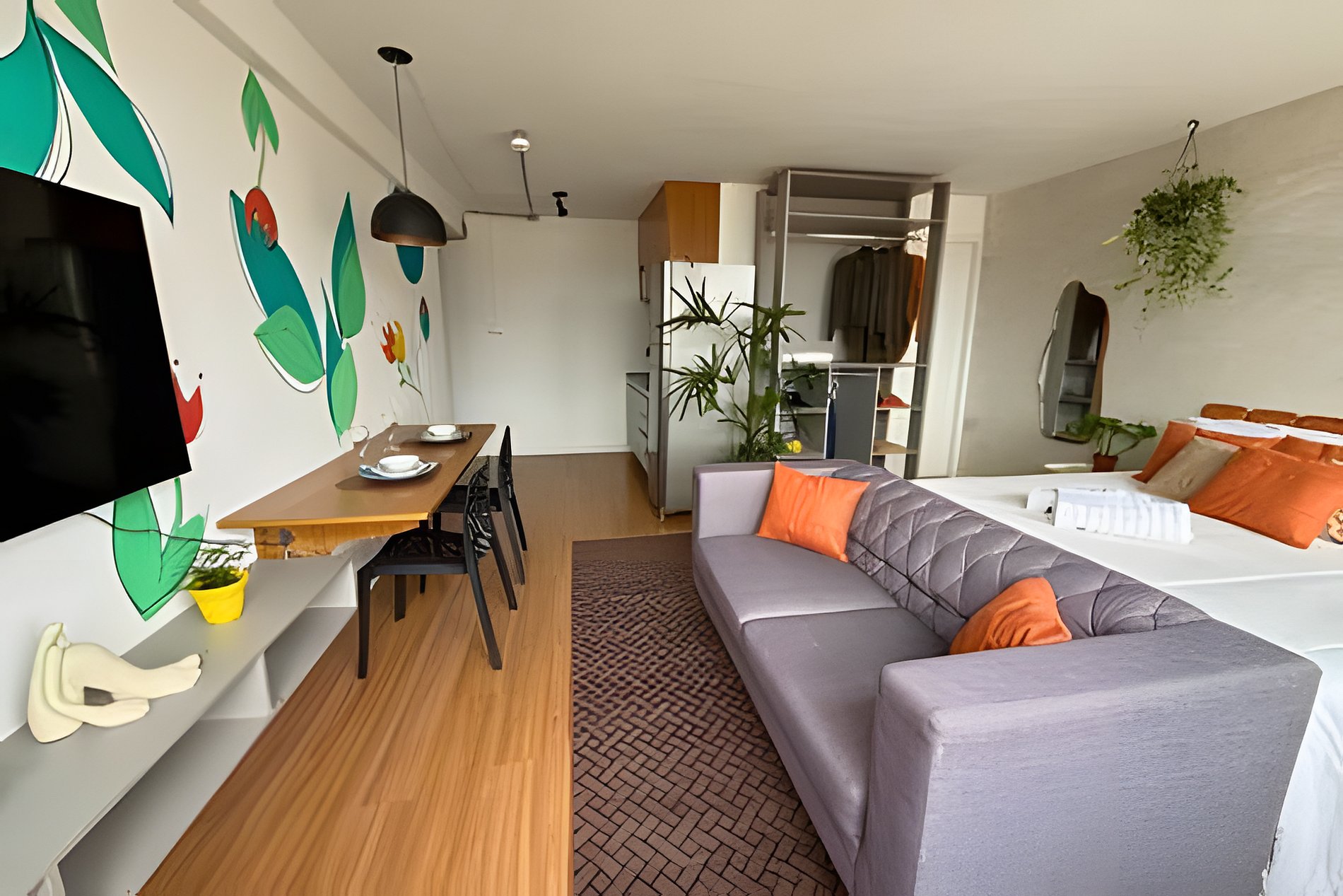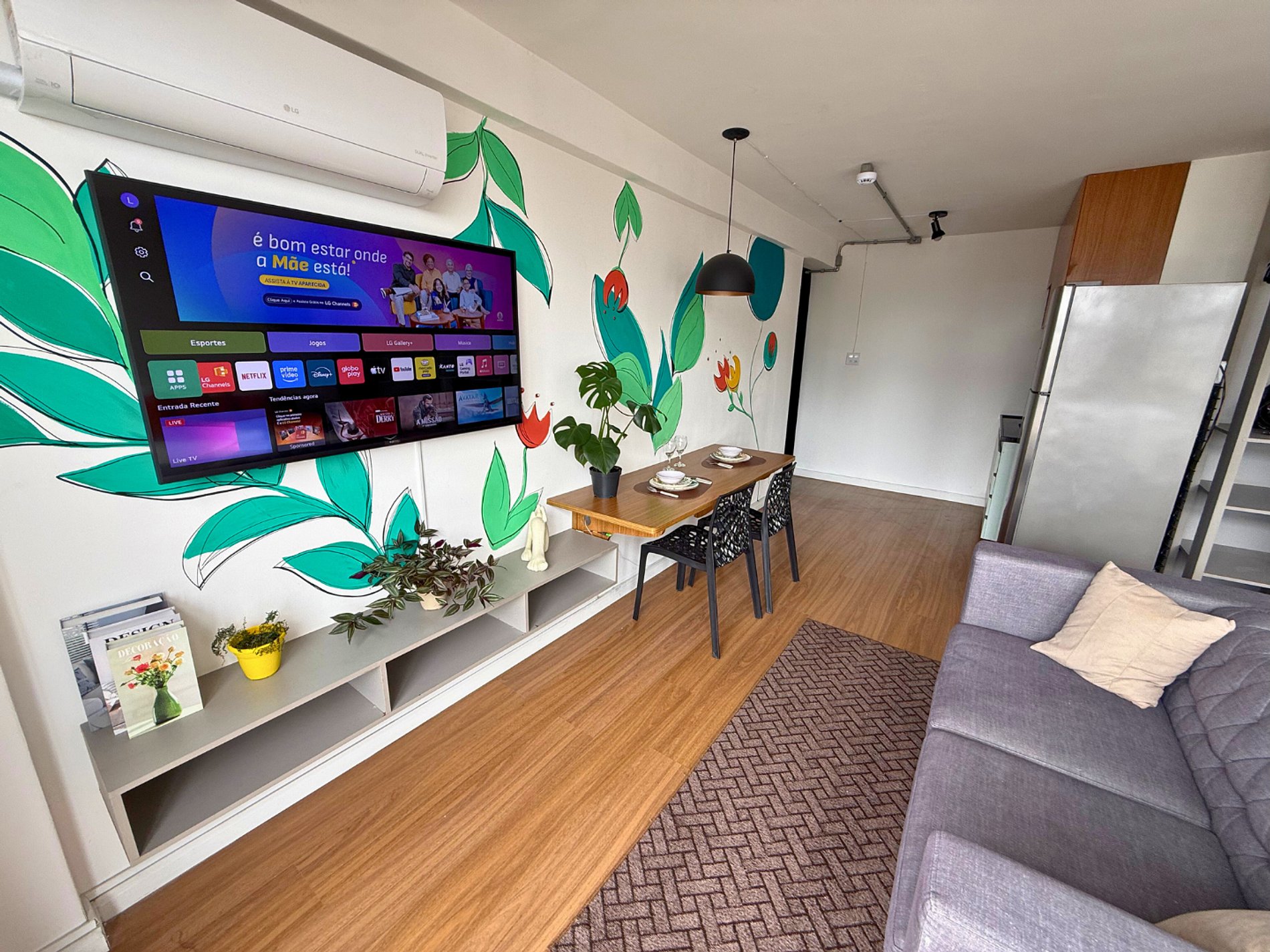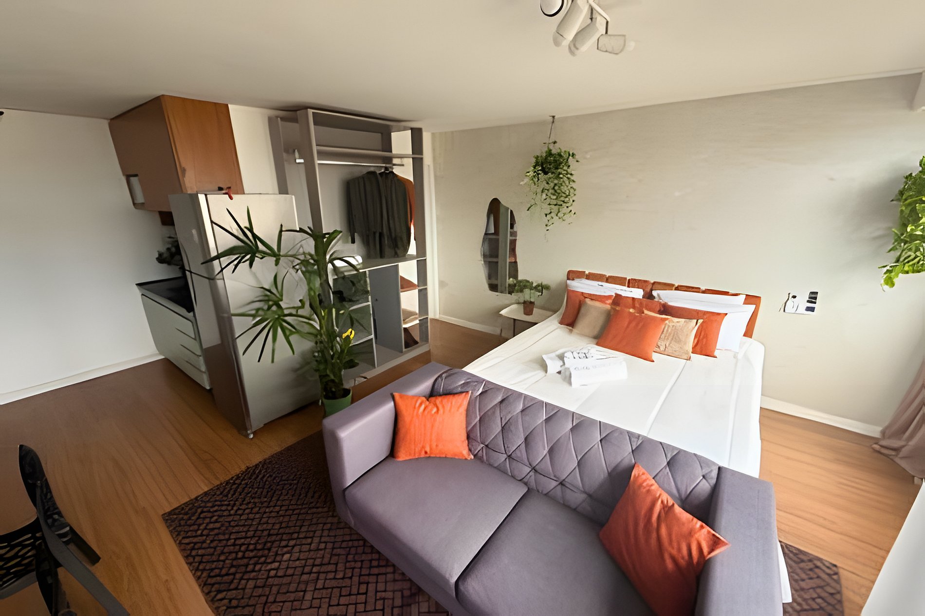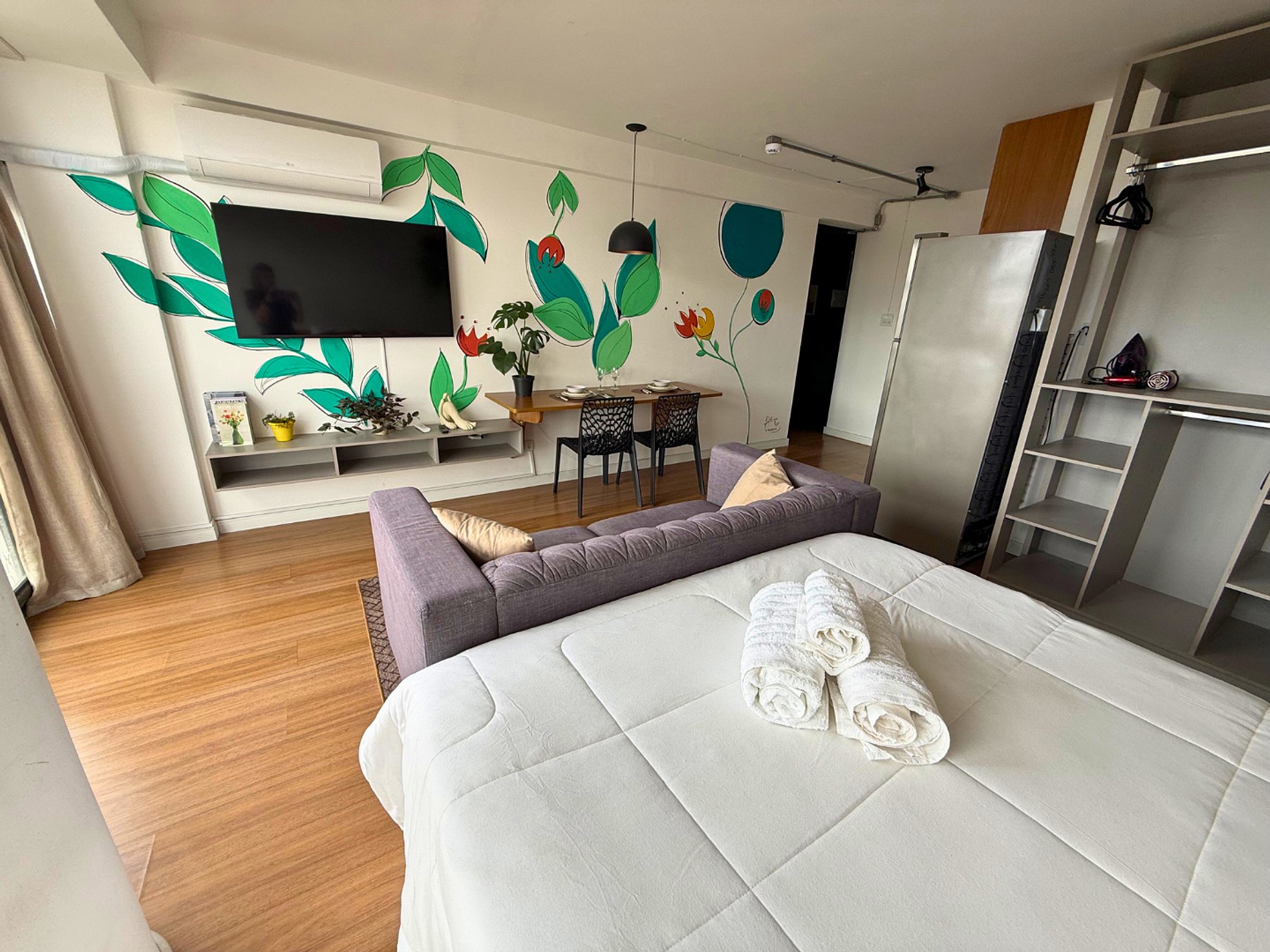 No 39º andar, voltado para o Vale do Anhangabaú, nosso Refúgio Floresta busca trazer a tranquilidade da natureza para o urbano. Apto cheio de comodidades. Dentre elas, destacamos a Smart TV, espaço de trabalho, internet de alta velocidade, cozinha completa com todos utensílios, guarda roupa, amplo banheiro, cama confortável com jogo completo de roupas de cama e banho, além de uma decoração linda composta por um trabalho artístico e diversas plantas naturais espalhadas por todo o apto.