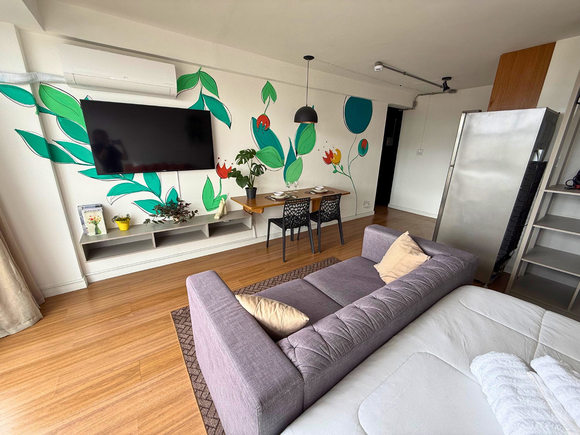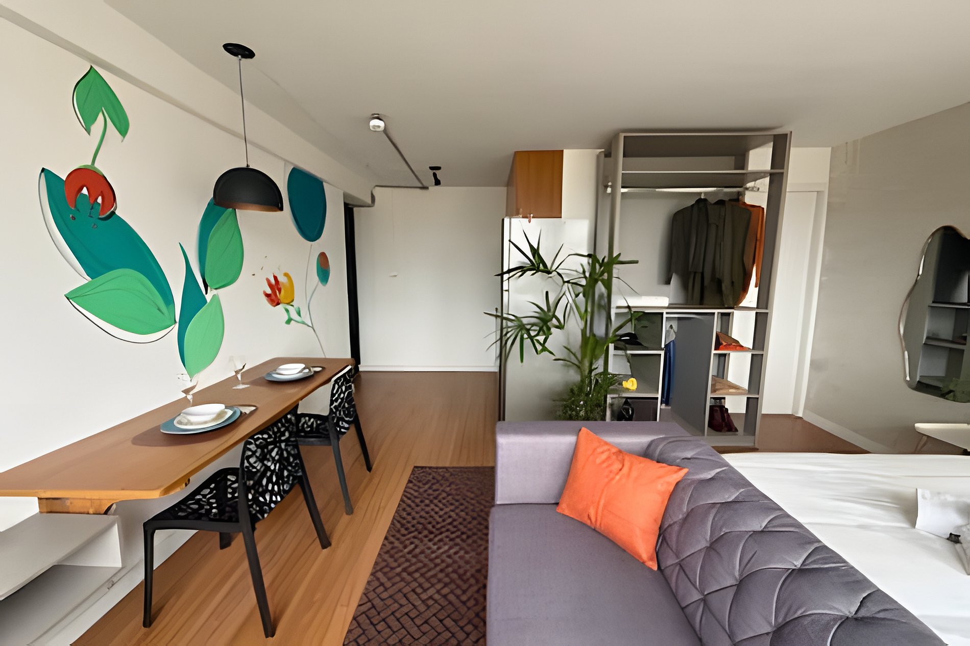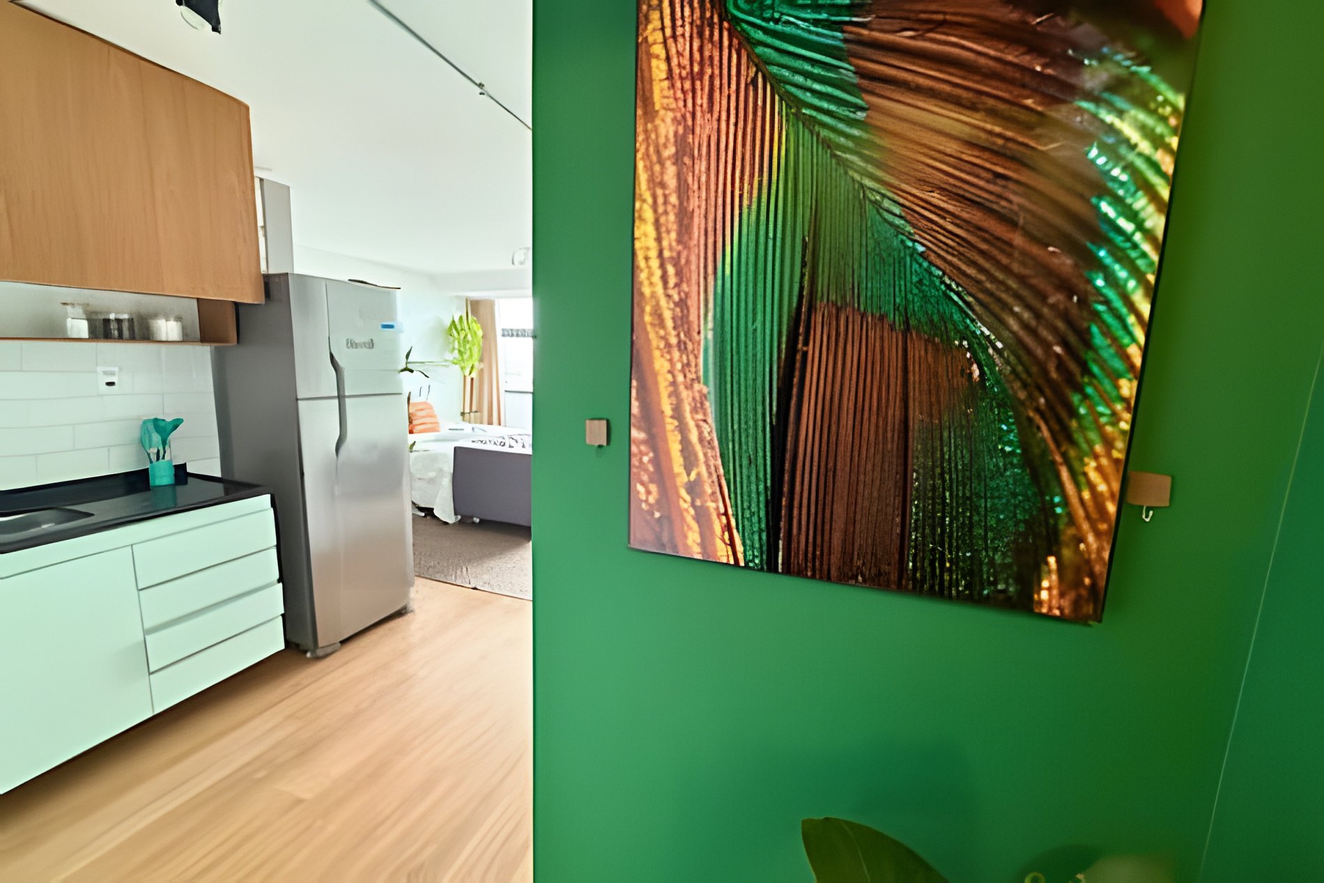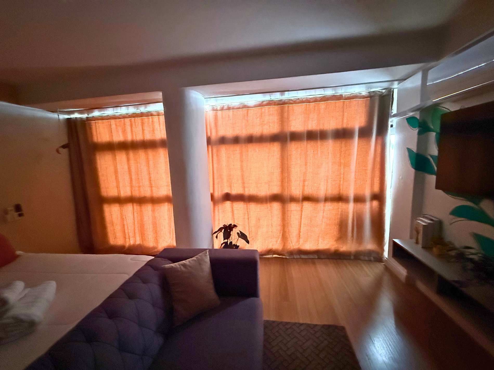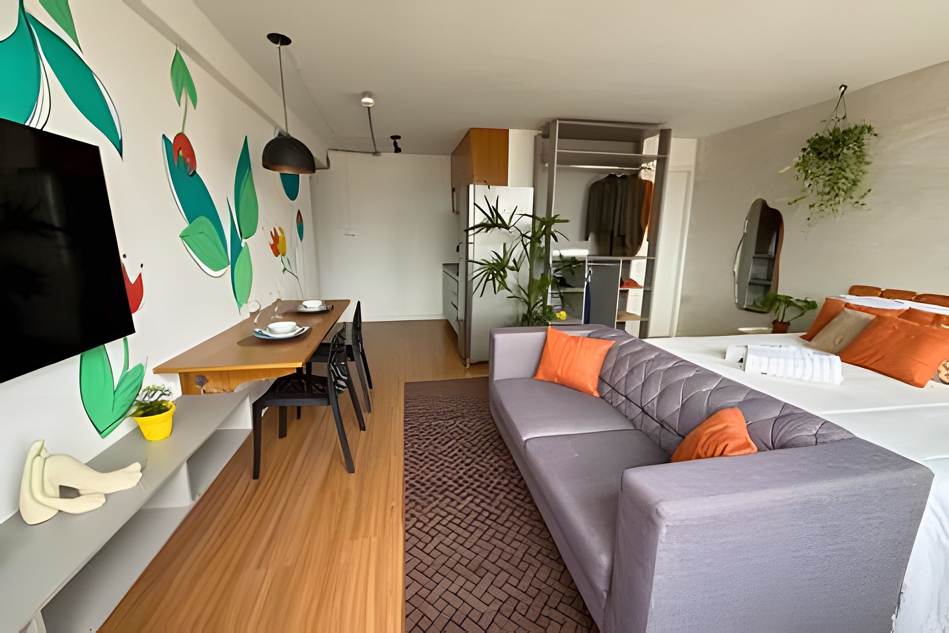 No 39º andar, voltado para o Vale do Anhangabaú, nosso Refúgio Floresta busca trazer a tranquilidade da natureza para o urbano. Apto cheio de comodidades. Dentre elas, destacamos a Smart TV, espaço de trabalho, internet de alta velocidade, cozinha completa com todos utensílios, guarda roupa, amplo banheiro, cama confortável com jogo completo de roupas de cama e banho, além de uma decoração linda composta por um trabalho artístico e diversas plantas naturais espalhadas por todo o apto.