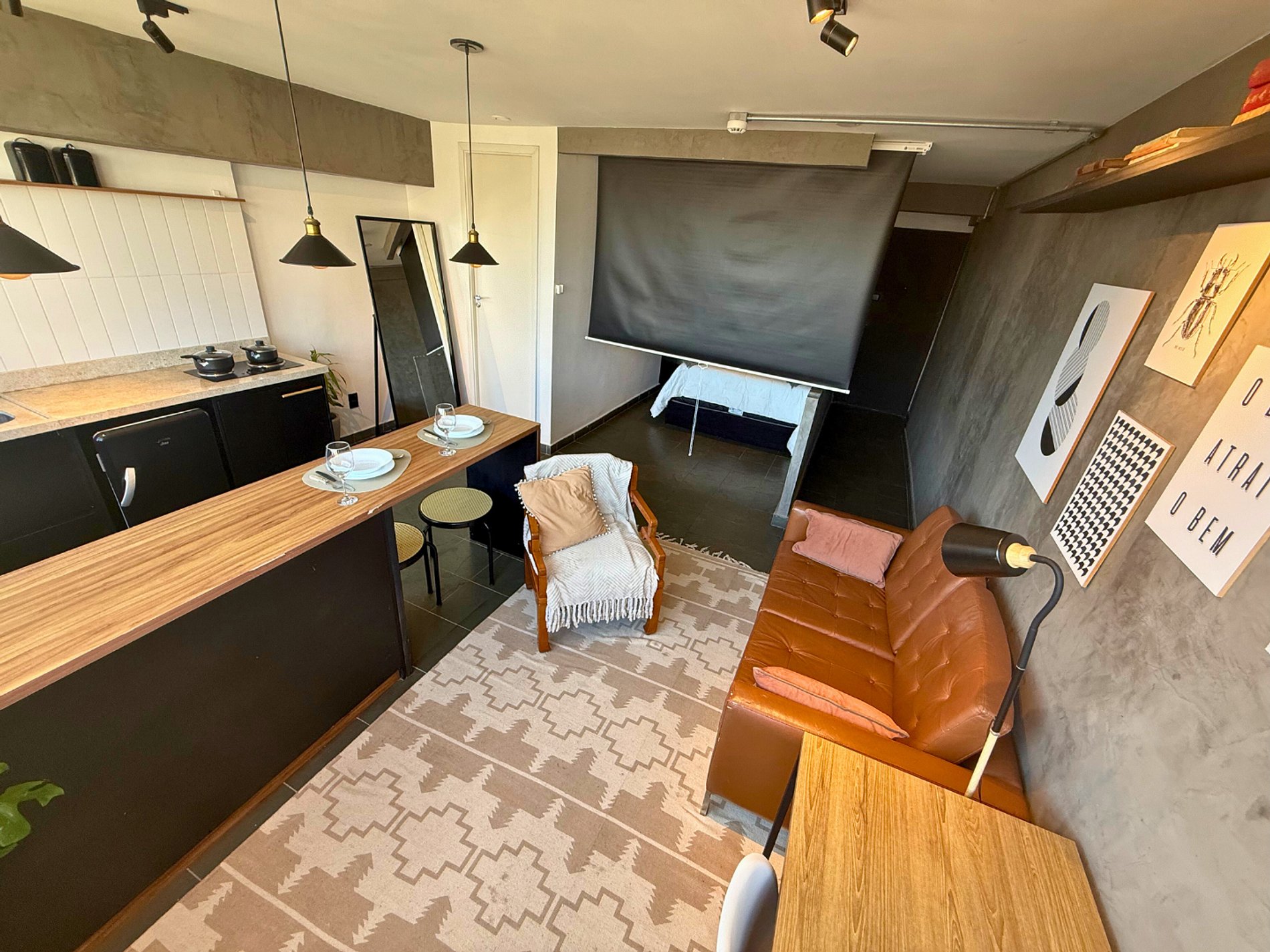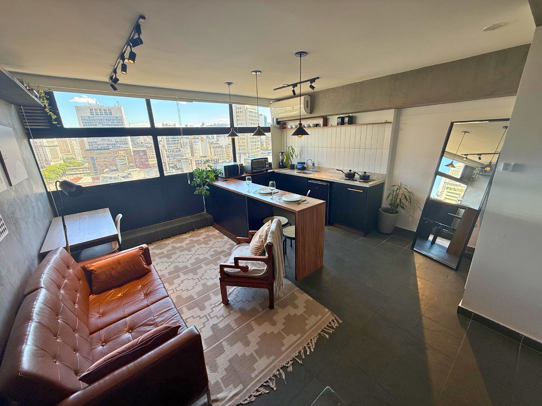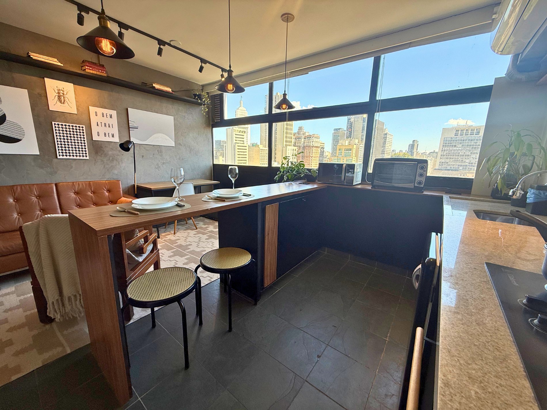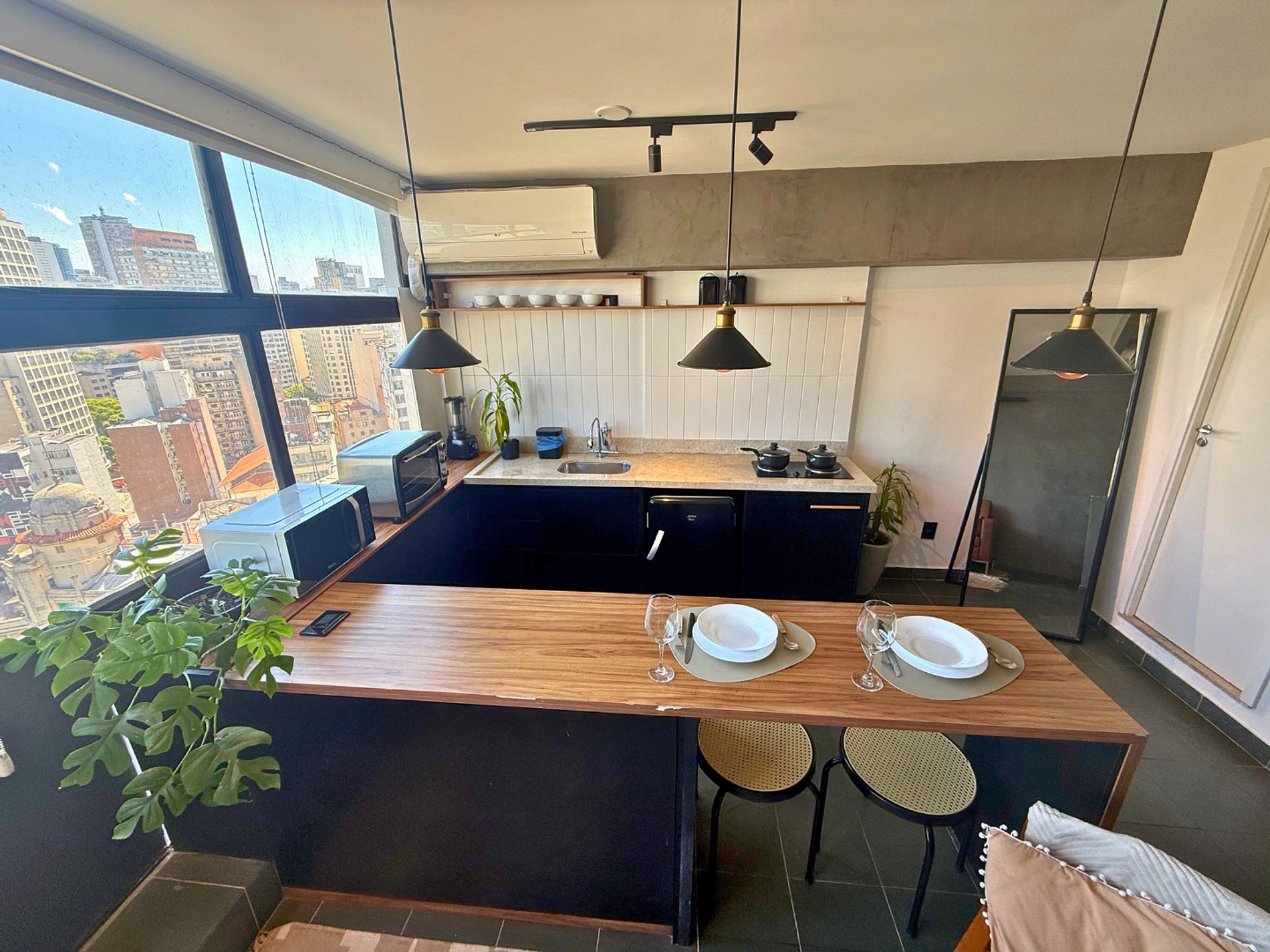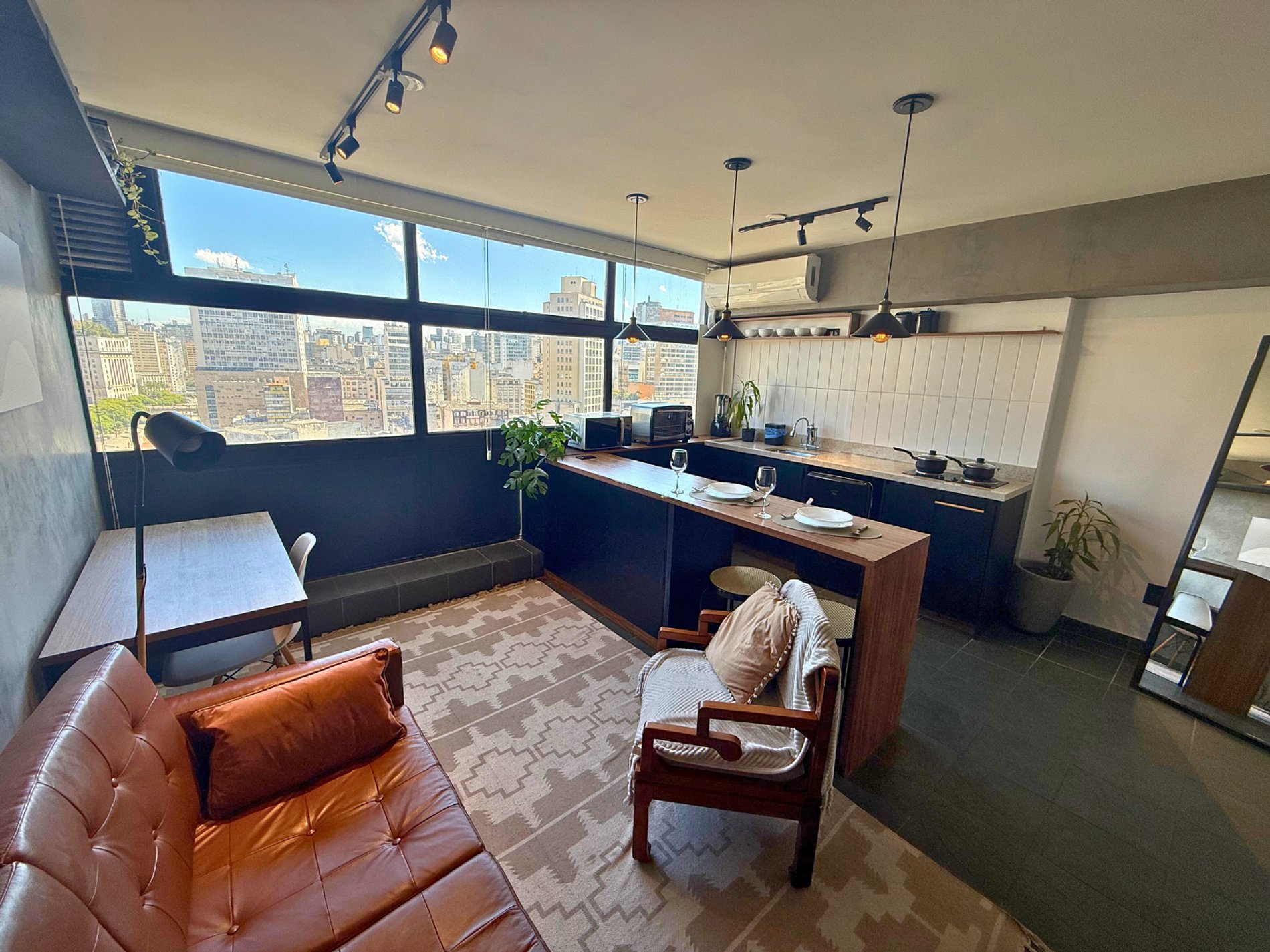 Studio projetado por @zairagon. Vista privilegiada para o Vale do Anhangabaú. O Mirante do Vale é o local do Sampa Sky. Baixe a tela em frente à cama e curta um verdadeiro cinema. O apto conta com projetor e chromecast para acesso aos principais streamings. Espaço projetado para te encantar: aconchegante, tem home office, AC, banheiro lindo, cozinha completa, design único, ótima iluminação e internet fibra veloz. Venha conhecer nosso incrível projeto. Estamos te esperando.