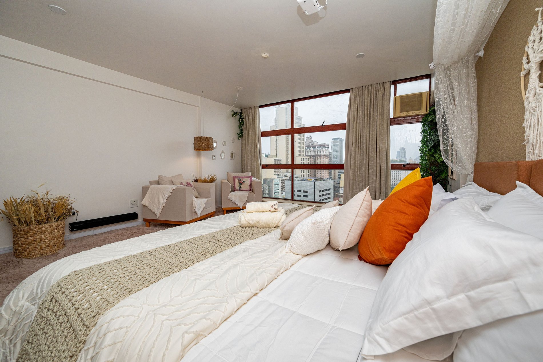 Aconchegante Airbnb no prédio do #SampaSky composto por Cama King envolta por um show de luzes, cama auxiliar para o 3º hóspede, Cinema HD que transforma uma parede em tela com uma qualidade de imagem impressionante, além de som Estéreo, cozinha completa com os principais itens para seu conforto, jogo de cama e toalhas de excelentes qualidade, indescritível vista para o Vale do Anhangabaú onde você poderá divertir identificando clássicos edifícios da nossa metrópole.