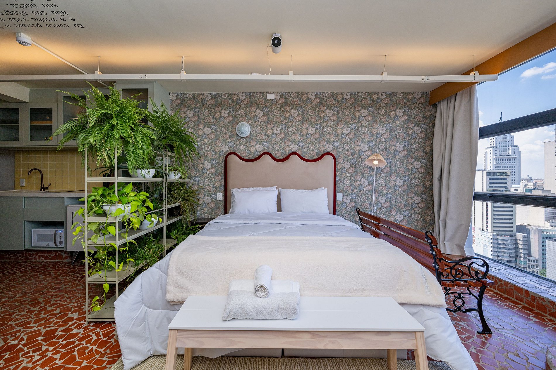 Sente-se no estiloso banco posicionado estrategicamente próximo à janela e aprecie a surreal vista para o Vale do Anhangabaú, marco da nossa cidade. Brinque de adivinhar os prédios históricos que nos rodeiam até chegar na Paulista, ao final do horizonte.